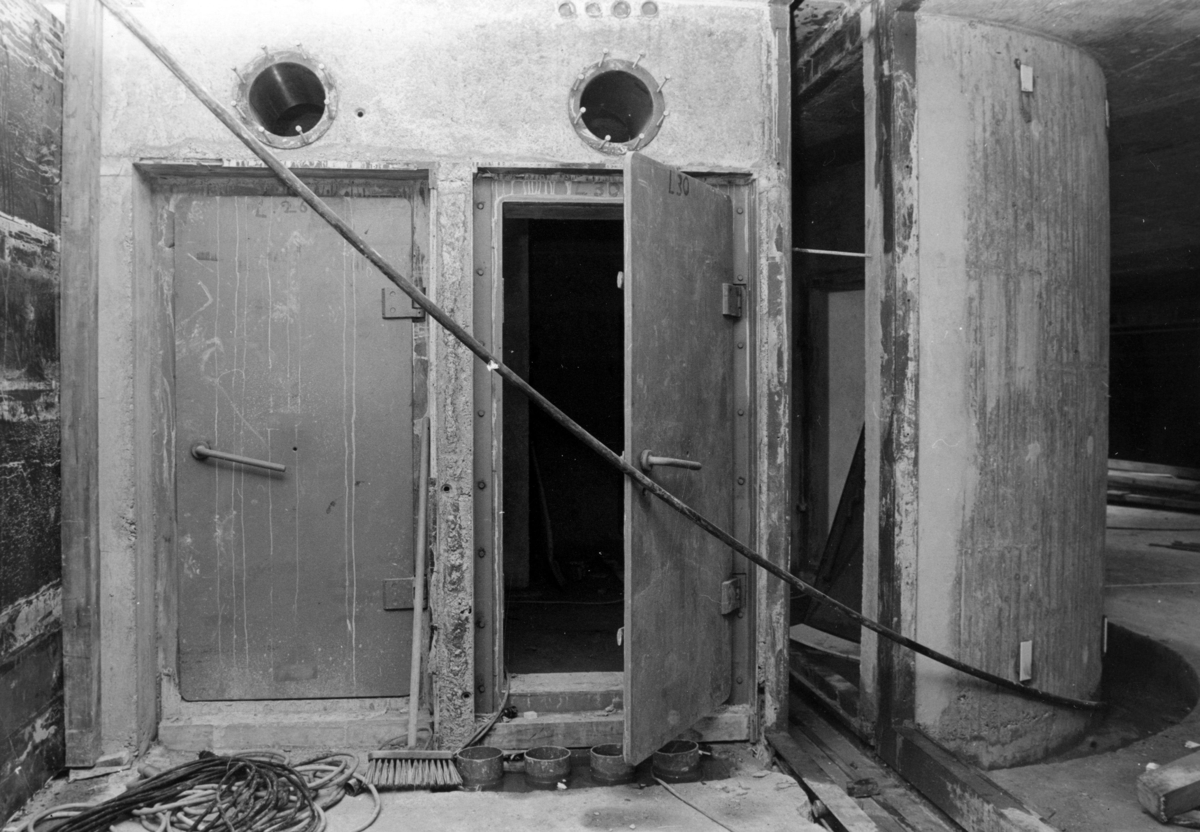 Afbeelding van de gasdichte deuren van de in aanleg zijnde schuilkelder van de B.B. (Bescherming Burgerbevolking) in de Noordertunnel onder het Stationsplein te Utrecht. Fotodienst GAU, fotograaf / 46165 / collectie Het Utrechts Archief - 1975 CC BY 4.0