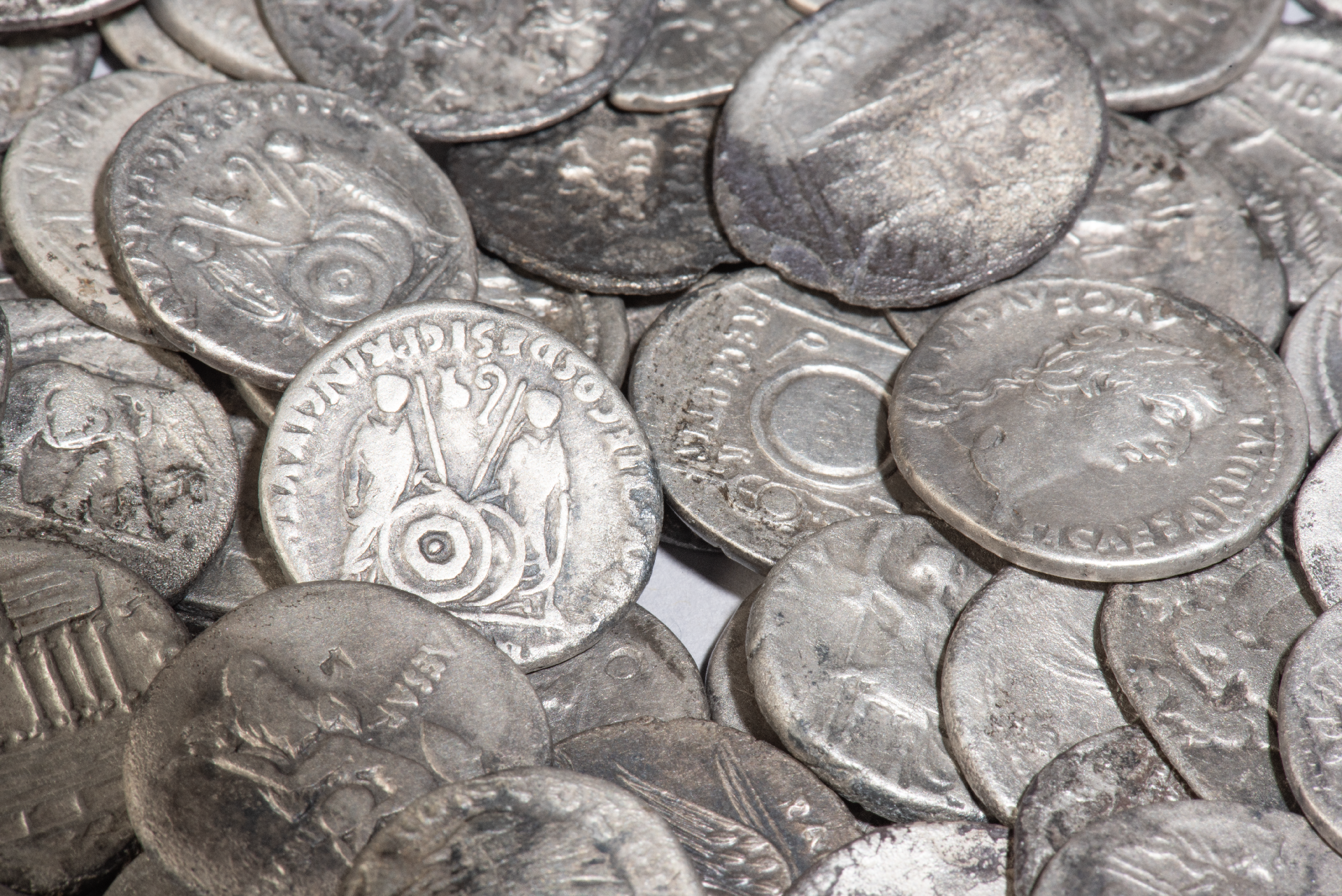 Een close-up van alle munten uit de Bunnikvondst van 2023. Rijksmuseum van Oudheden - 2024 CC0 1.0