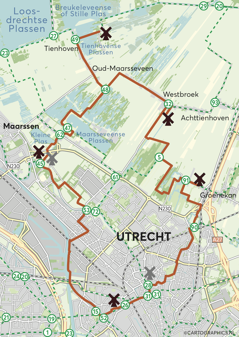 Deze fietsroute, ontwikkeld door het initiatief Zij is Molenaar, leidt je langs Groenekan, Utrecht, Maarssen, Tienhoven en Westbroek. Je fietst op het grensgebied van de stad Utrecht en het uitgestrekte landschap van de Vechtplassen. Onderweg kom je langs een aantal prachtige Utrechtse molens waar vrouwelijke molenaars de dienst uitmaken. Aangekomen bij ‘hun’ molens, kun je met je telefoon een QR code scannen en naar hun verhalen luisteren. Een perfecte fietspauze. Deze zesde route is 34 kilometer lang.