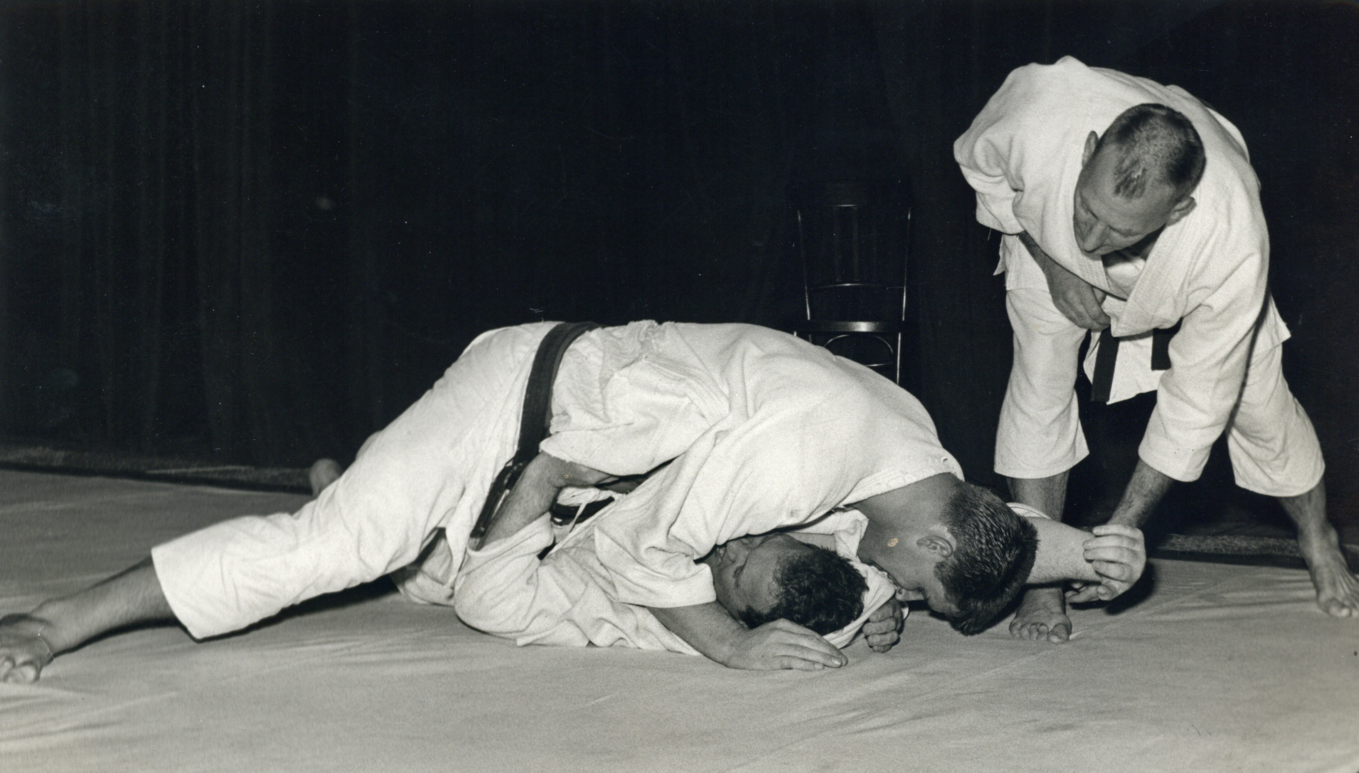 Afbeelding van een judowedstrijd van Anton Geesink tijdens internationale demonstratiewedstrijden in het NV-huis (Oudegracht 245) te Utrecht. Hofland, L.H., fotograaf / 823686 / collectie Het Utrechts Archief - 1954 CC BY 4.0