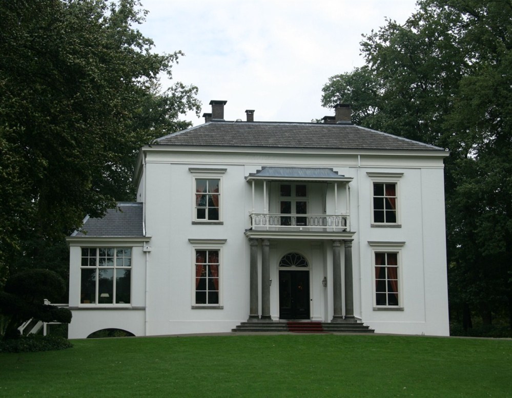Op een verhoogd stuk grond ligt het kleine witte landhuis van de buitenplaats Blikkenburg. Het eenvoudige, neoclassicistische gebouw ligt in een landschapspark, met veel gras en losstaande bomen.