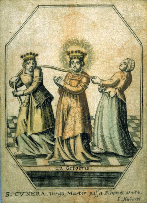 Een nogal rigoureus plan: ze wil haar eigenhandig ombrengen. Ze kiest het moment zorgvuldig uit. Op 28 oktober 340, wanneer de koning met zijn mannen op valkenjacht is, moet het gebeuren. Dan besluipen de koningin en haar dienstmeid de geliefde prinses. Ze wurgen haar met de halsdoek die Cunera voor haar bedevaartstocht kreeg van haar ouders. Vervolgens begraven ze haar in de paardenstal bij het kasteel.