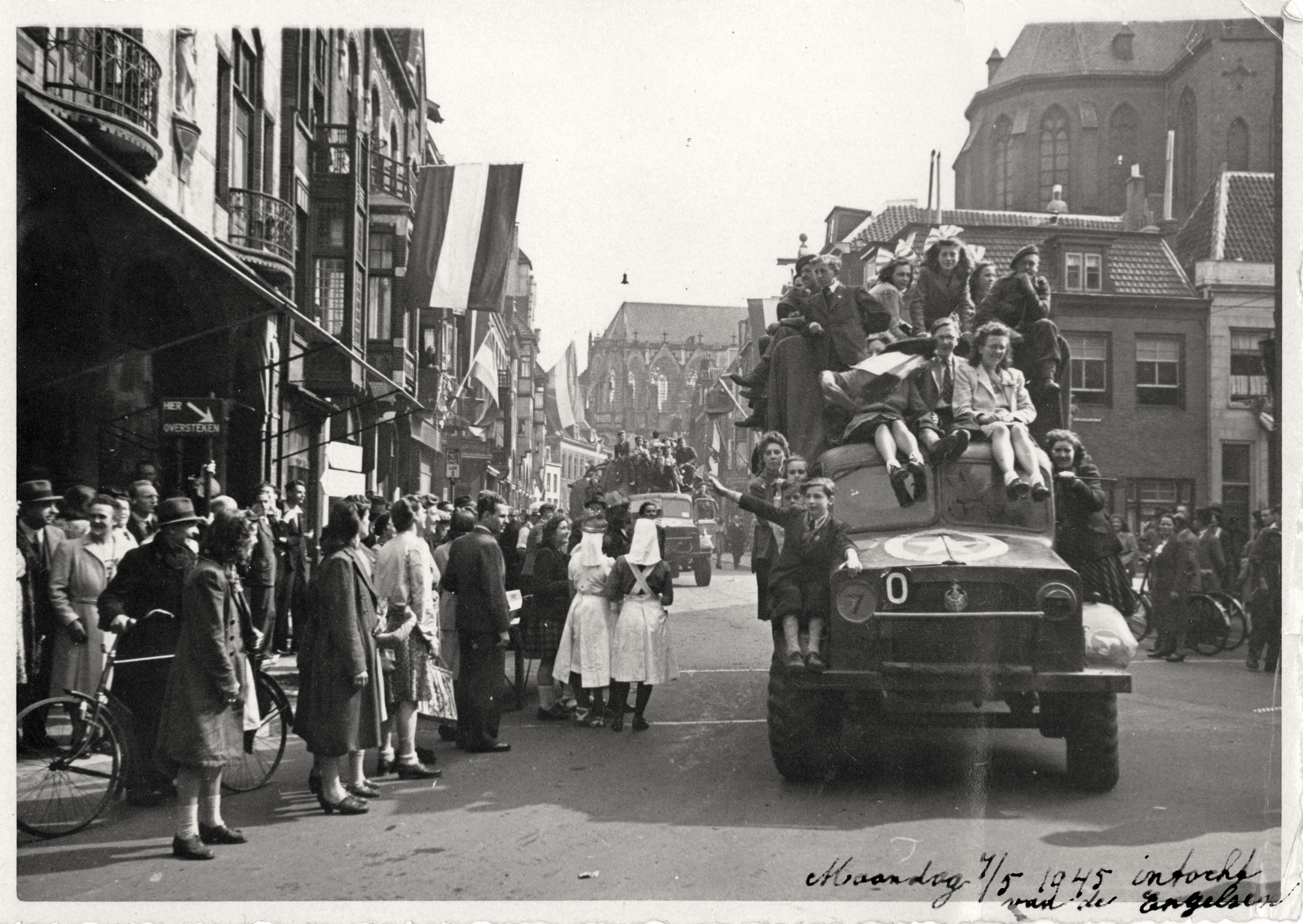 Afbeelding van de feestelijke intocht van de geallieerden in de Korte Jansstraat te Utrecht, tijdens de bevrijding van Utrecht. F.F. van derWerf, fotograaf / collectie Het Utrechts Archief / 502486 - 1945 CC BY 4.0