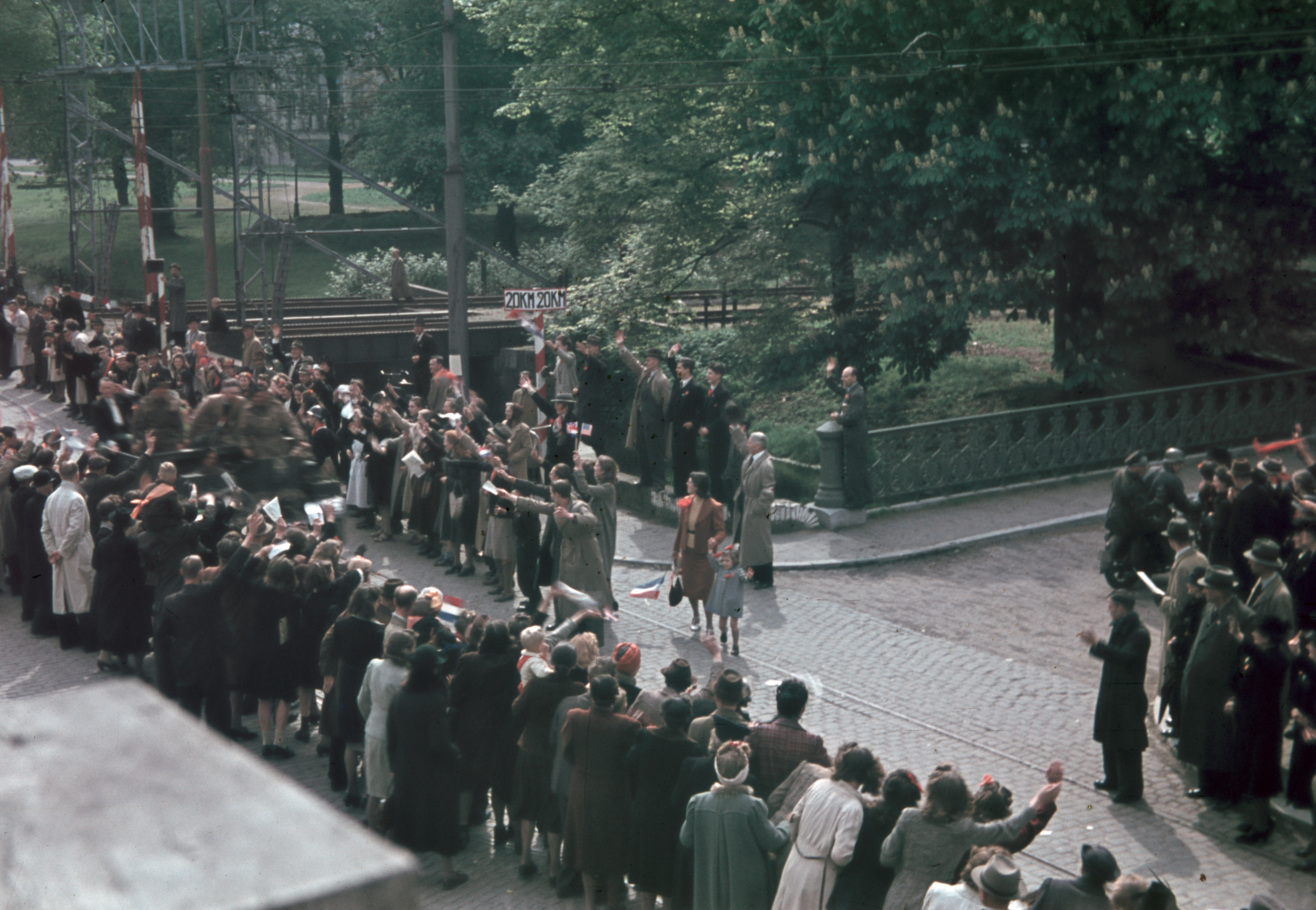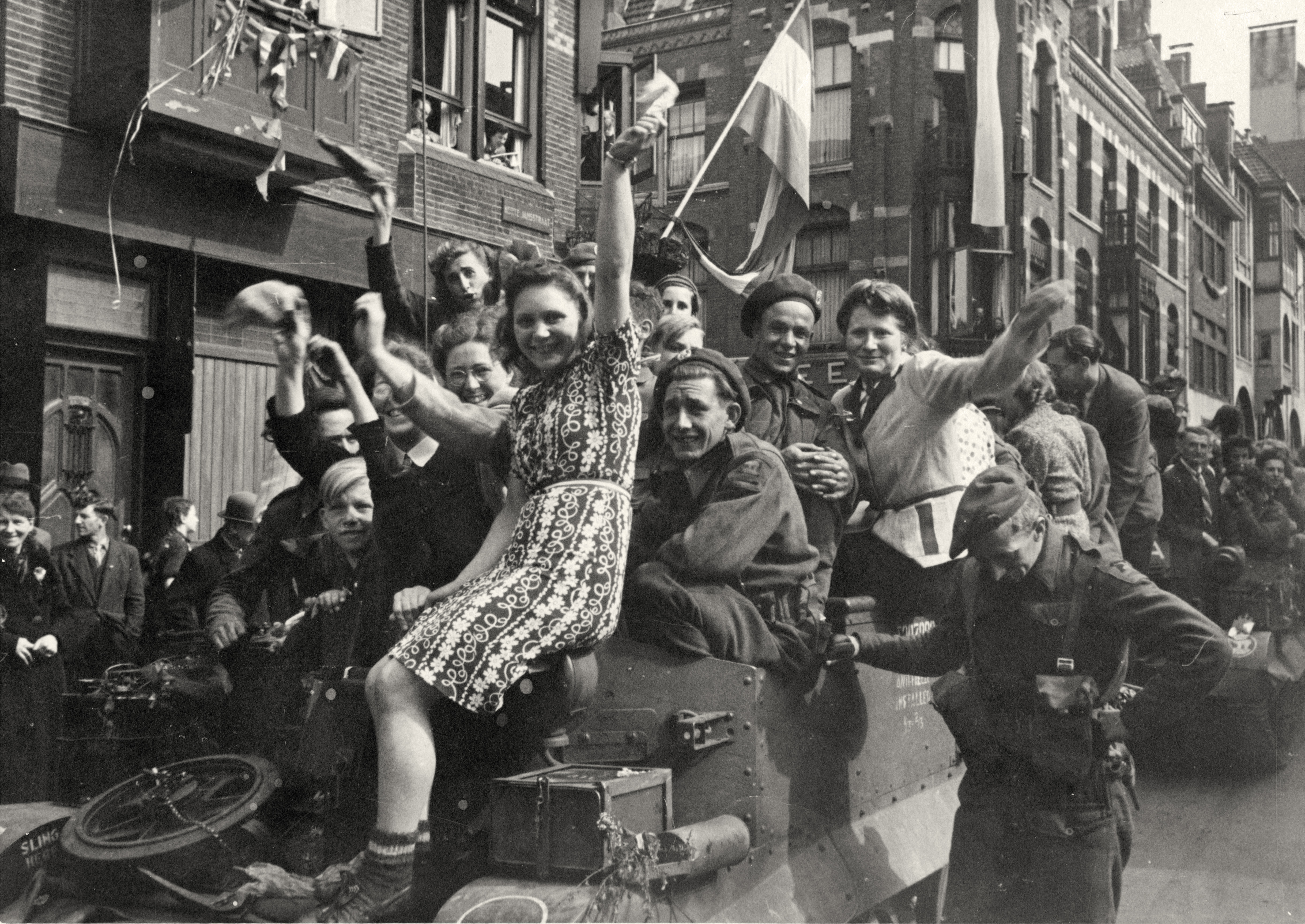 Afbeelding van de intocht van de geallieerden in Utrecht, op de Biltstraat ter hoogte van de Museumbrug. Onbekend / 22185 / collectie Het Utrechts Archief - 1945 CC0