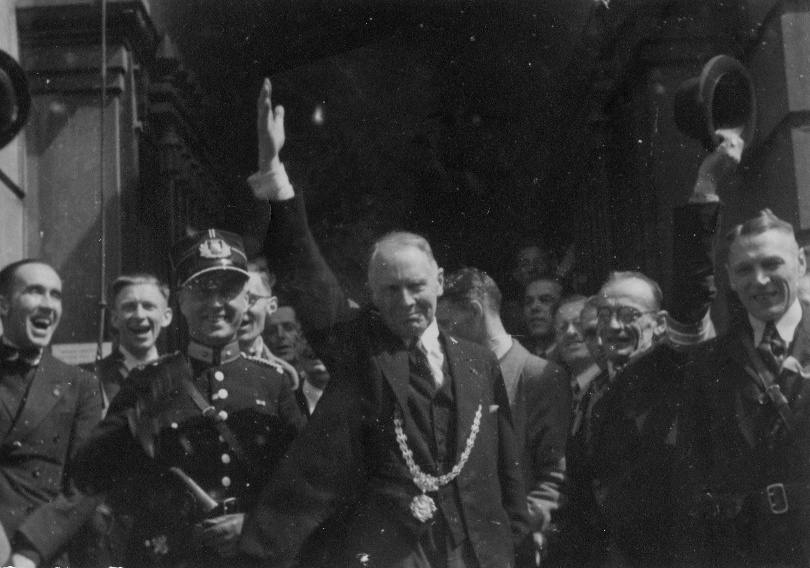 Vanuit De Bilt trekken op maandag 7 mei 1945 dan eindelijk Canadese en Britse troepen de stad binnen. In de straten van Utrecht verzamelde zich ondertussen een juichende menigte. Ook burgemeester Ter Pelkwijk keert terug naar het stadhuis. Hij was eerder door de bezetter afgezet en vervangen door een NSB-burgemeester. Op het bordes ontvangt Ter Pelkwijk de commandant van de bevrijdingstroepen.