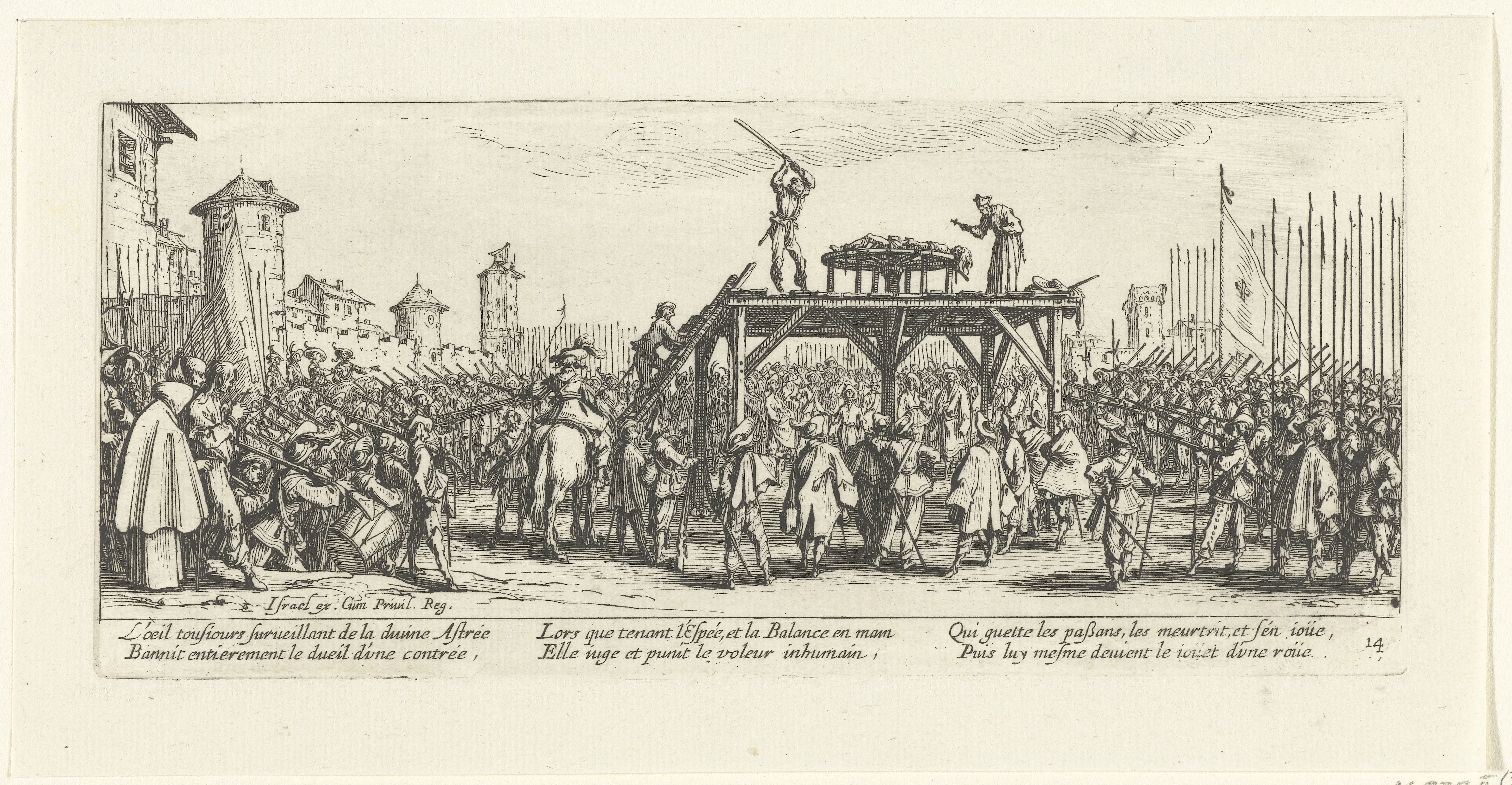 Op een open plek bij een stadsmuur zijn vele soldaten verzameld rond een platform waarop een man geradbraakt wordt. Onder de voorstelling een zesregelig Frans vers. Deze prent is onderdeel van een serie van 17 (18 incl. titelprent) prenten met voorstellingen van diverse soorten ellende die oorlogvoering met zich meebrengt. Jacques Callot / collectie Rijksmuseum - 1633 CC0