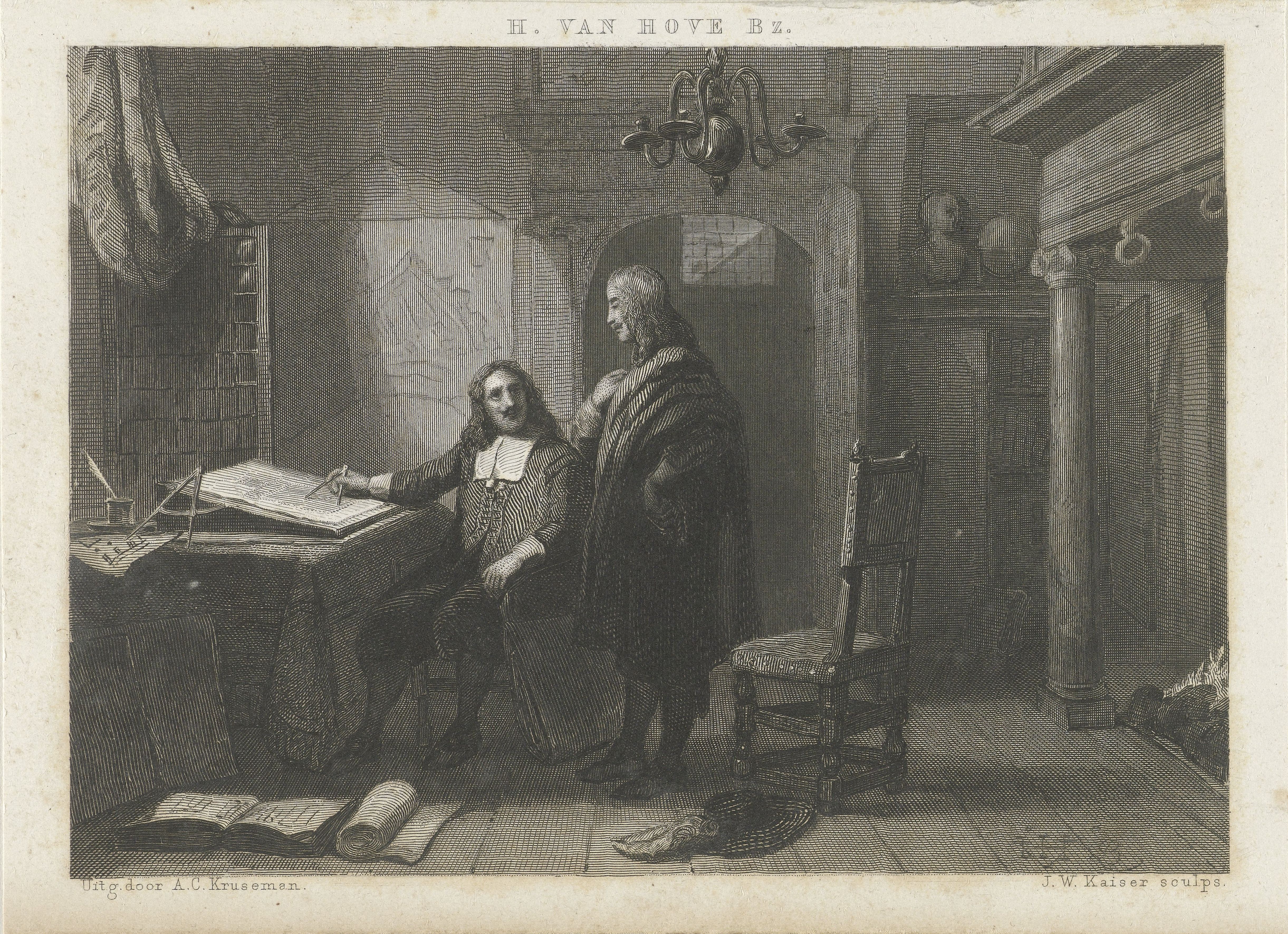 In een vertrek zit Jacob van Campen aan een bureau. Hij heeft een passer in zijn hand en kijkt naar de man die naast hem staat. Naast het bureau hangt een plattegrond en op de voorgrond liggen een boek een hoed. Johann Wilhelm Kaiser (prentmaker), Huib van Hove Bz (ontwerp) / RP-P-1908-4320 / Het Rijksmuseum - 1850 CC0 1.0