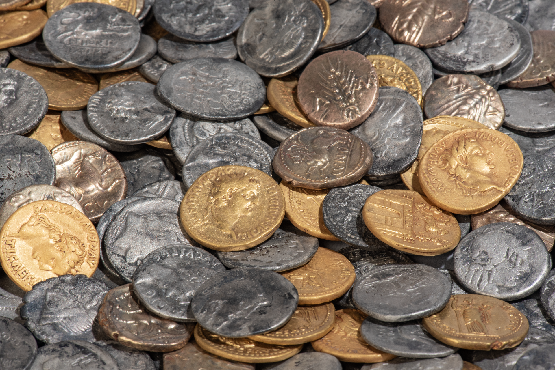 Een close-up van alle munten uit de Bunnikvondst van 2023. Rijksmuseum van Oudheden - 2024 CC0 1.0