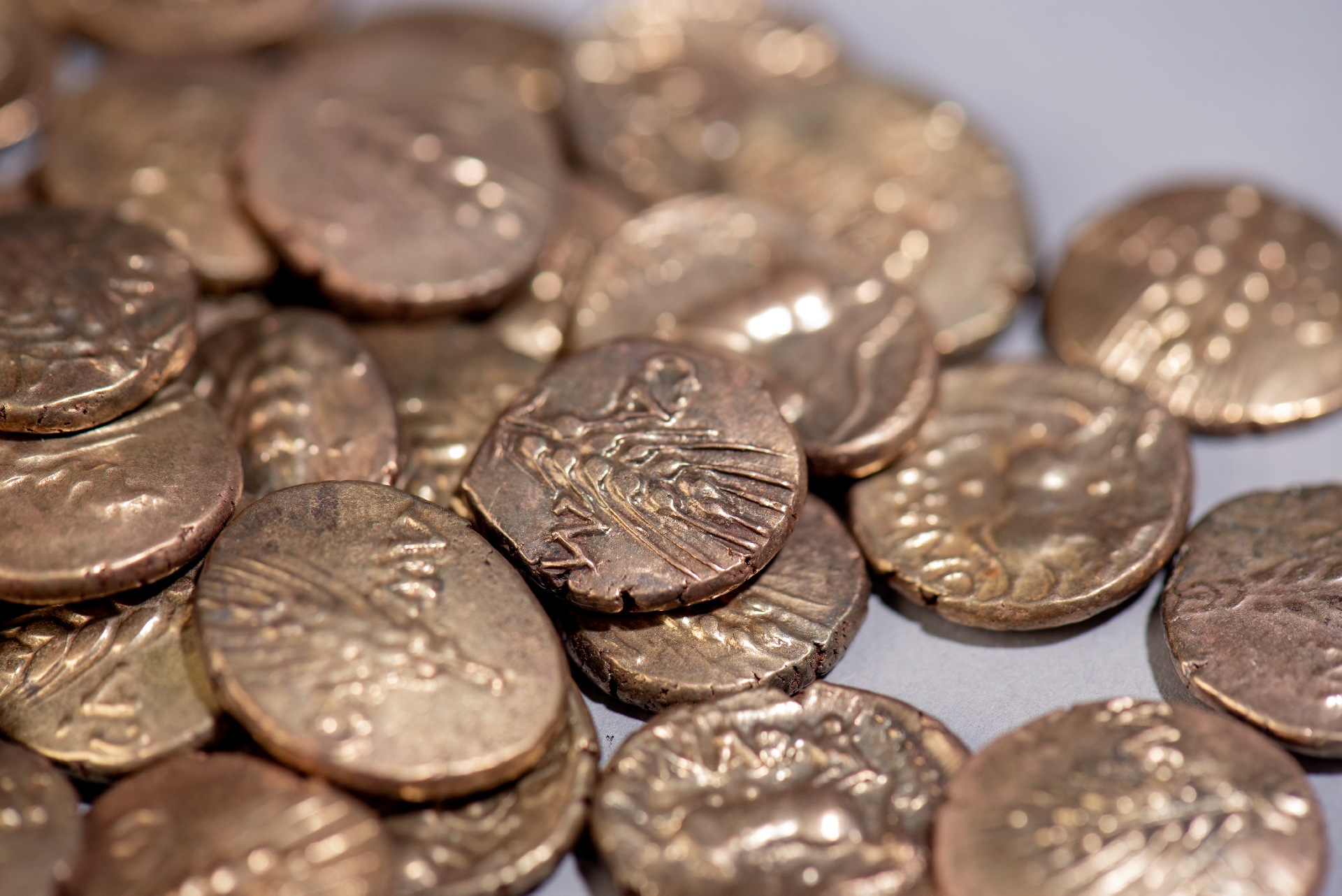 De jongste Romeinse exemplaren zijn geslagen in de jaren 46-47, ten tijde van keizer Claudius. In die periode steken Romeinse legertroepen de Noordzee over om ‘Britannia’ te veroveren. 44 gouden exemplaren komen uit het huidige Groot-Brittannië, daarop staat de naam van de Britse koning Cunobelinus. Waarschijnlijk zijn de munten na de eerste veroveringen door terugkerende Romeinse soldaten vanuit Britannia naar Bunnik meegenomen: de Romeinse exemplaren als soldij en de Britse als krijgsbuit.