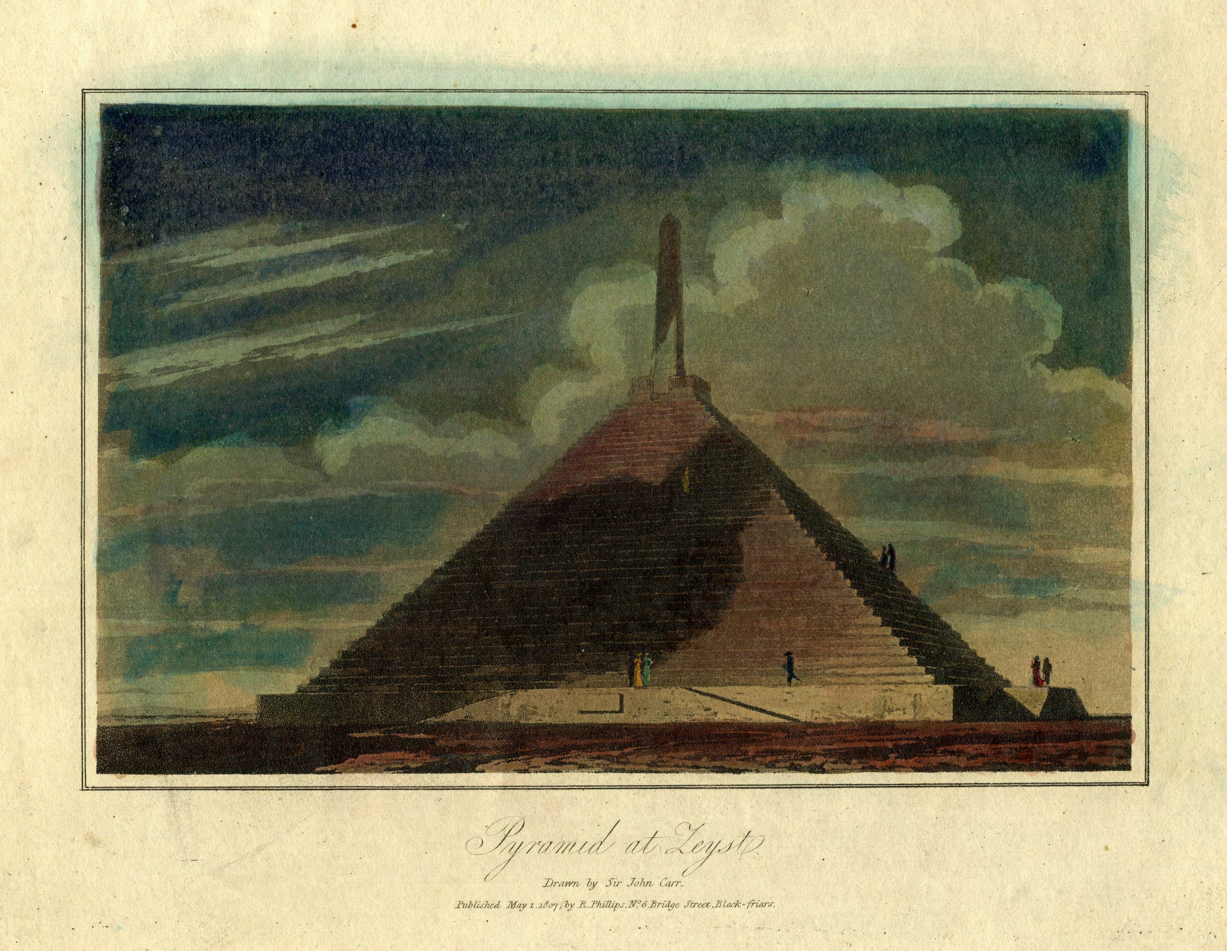 Gezicht op de Pyramide van Austerlitz kort na de bouw, medio 1804. Anonieme, met de hand ingekleurde prent naar een tekening van Sir John Carr uit ca.1807, uitgegeven door R. Philips, Londen, in 1807. Trenkler Co., Dr., uitgever / 200354 / collectie Het Utrechts Archief - 1807 CC0