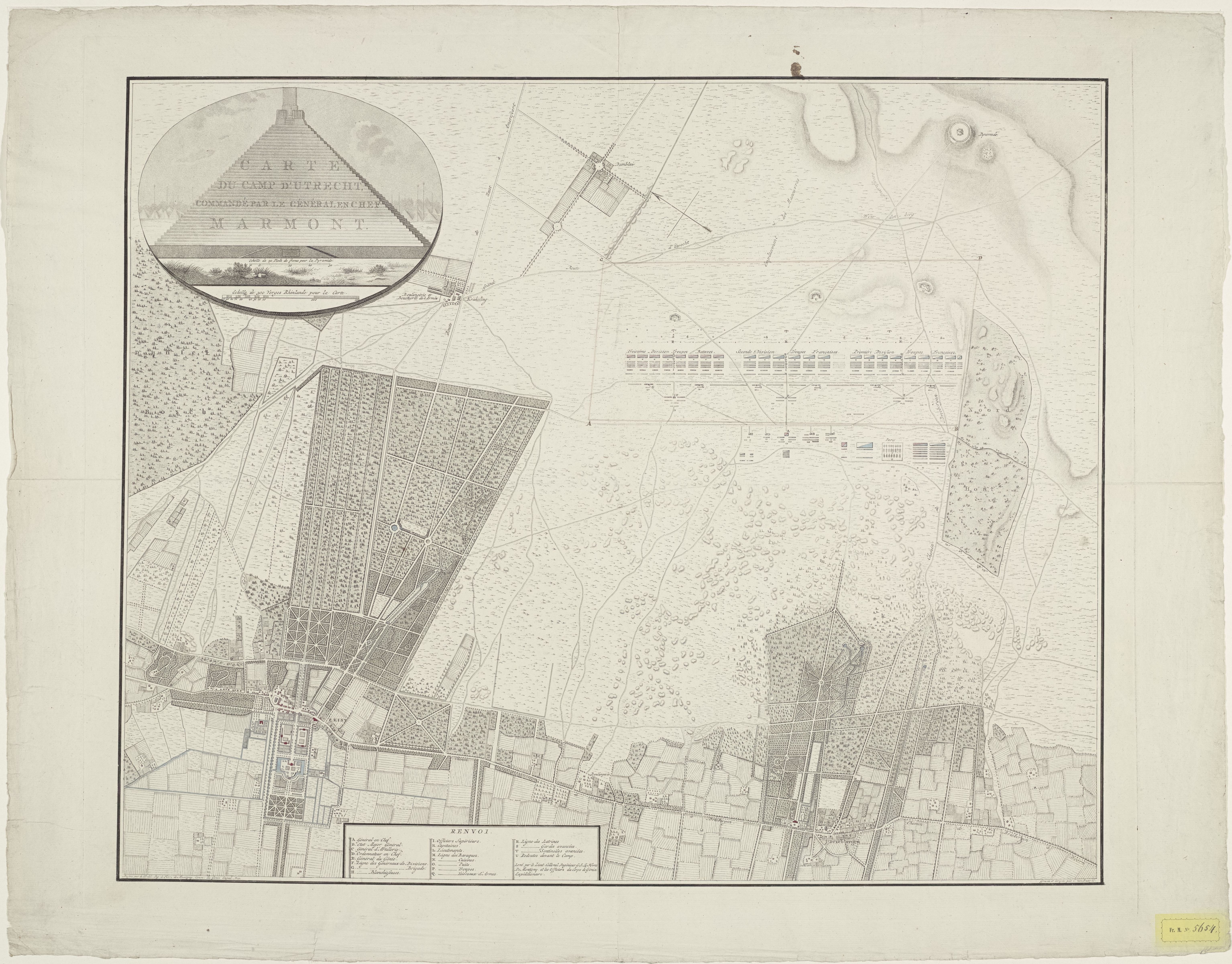 Kaart van het gebied tussen Zeist en Driebergen met het legerkamp van het Bataafse en Franse leger onder leiding van generaal Auguste de Marmont, 1804-1805. Linksboven een inzet met een gezicht op de pyramide van Austerlitz, opgetrokken in 1804 door de aldaar gelegerde soldaten. Kaart met het legerkamp bij Zeist - 1805 - 1805 CC0