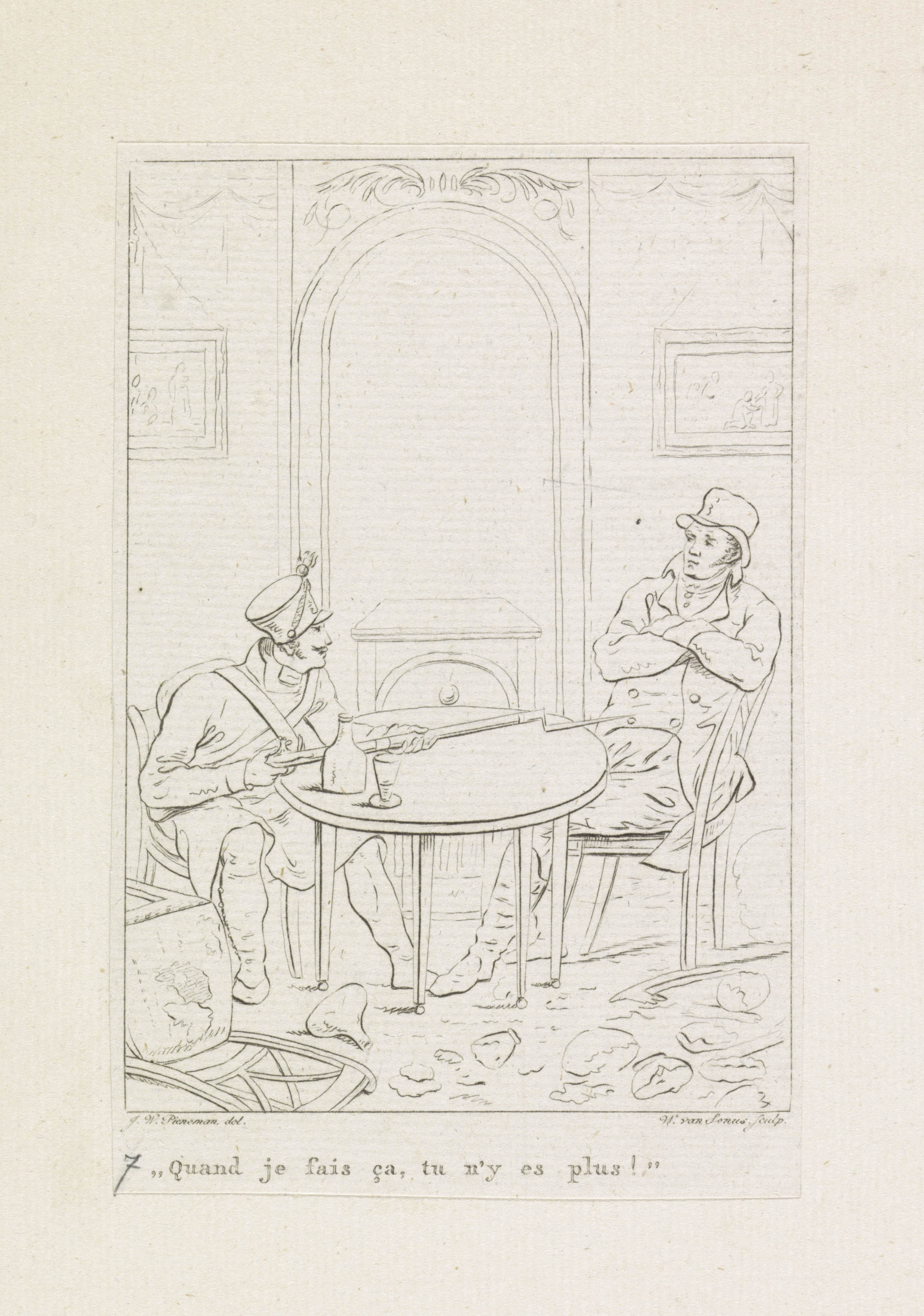 Mr. Jan Meulman bedreigd door een Franse militair met een geweer. Willem van Senus - 1813 CC0 Publiek Domein