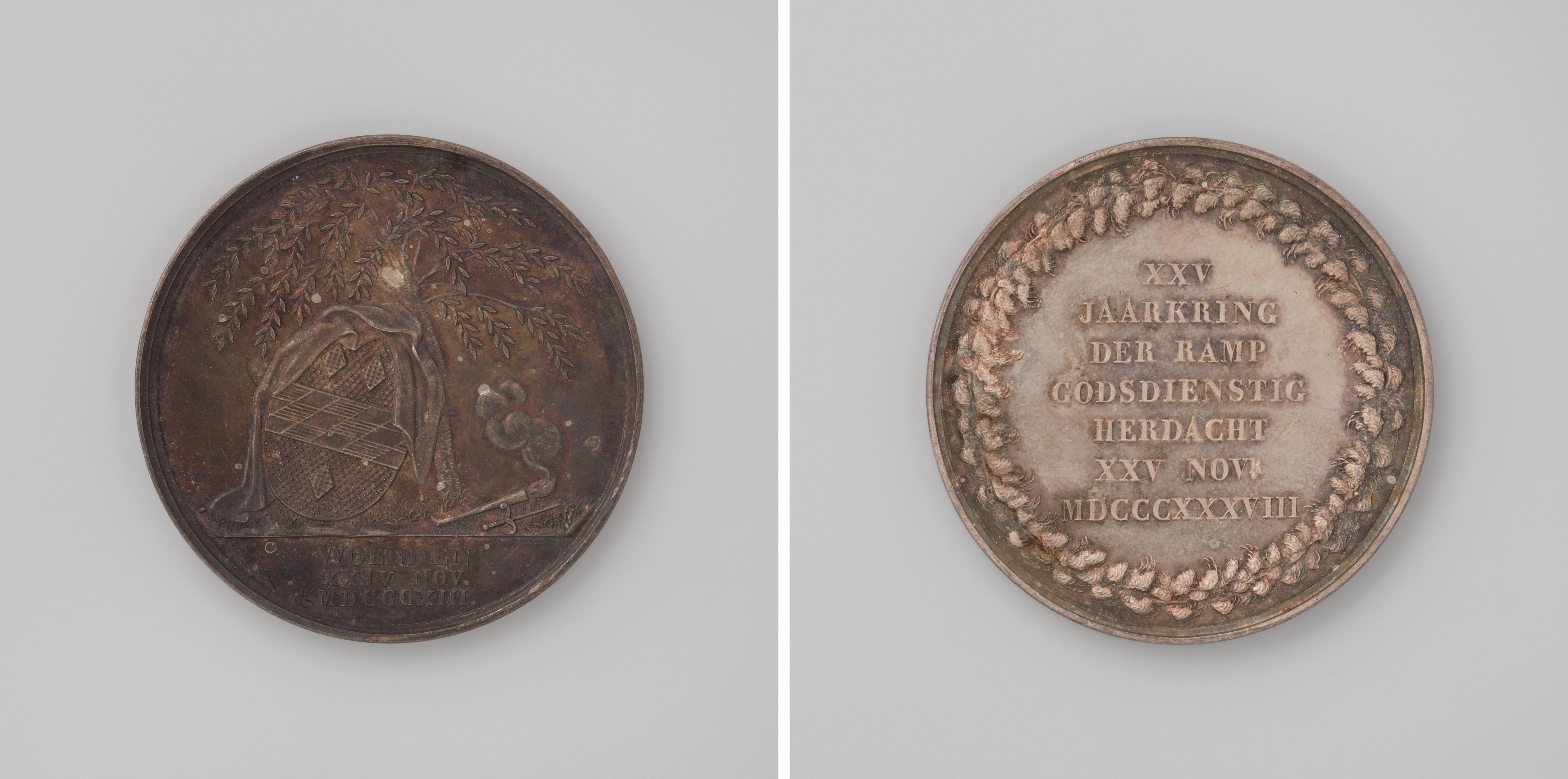 Zilveren penning voor de vijfentwintigjarige herdenking van de Ramp van Woerden. Op de voorzijde: wapenschild, rustend tegen een cipres; aan voet daarvan een rokende fakkel en dolk. David van der Kellen - 1838 CC0 Publiek Domein
