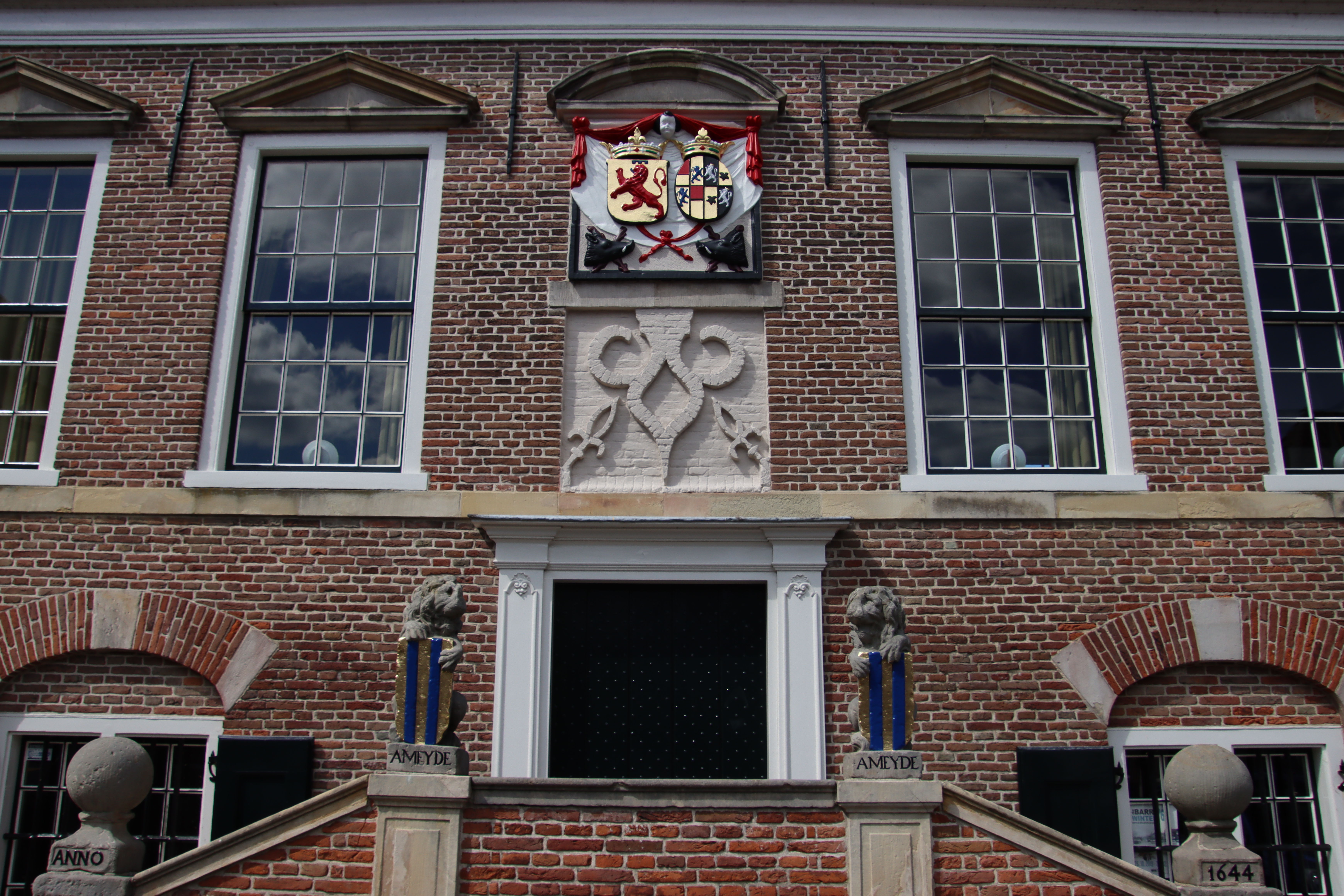 De voorgevel het Stadhuis op de Dam te Ameide met het gerestaureerde alliantiewapen van Johan Wolfert van Brederode (1599-1655) en zijn echtgenote Louise Christine van Solms-Braunfels (1606-1669). Carl Weeda - 2020