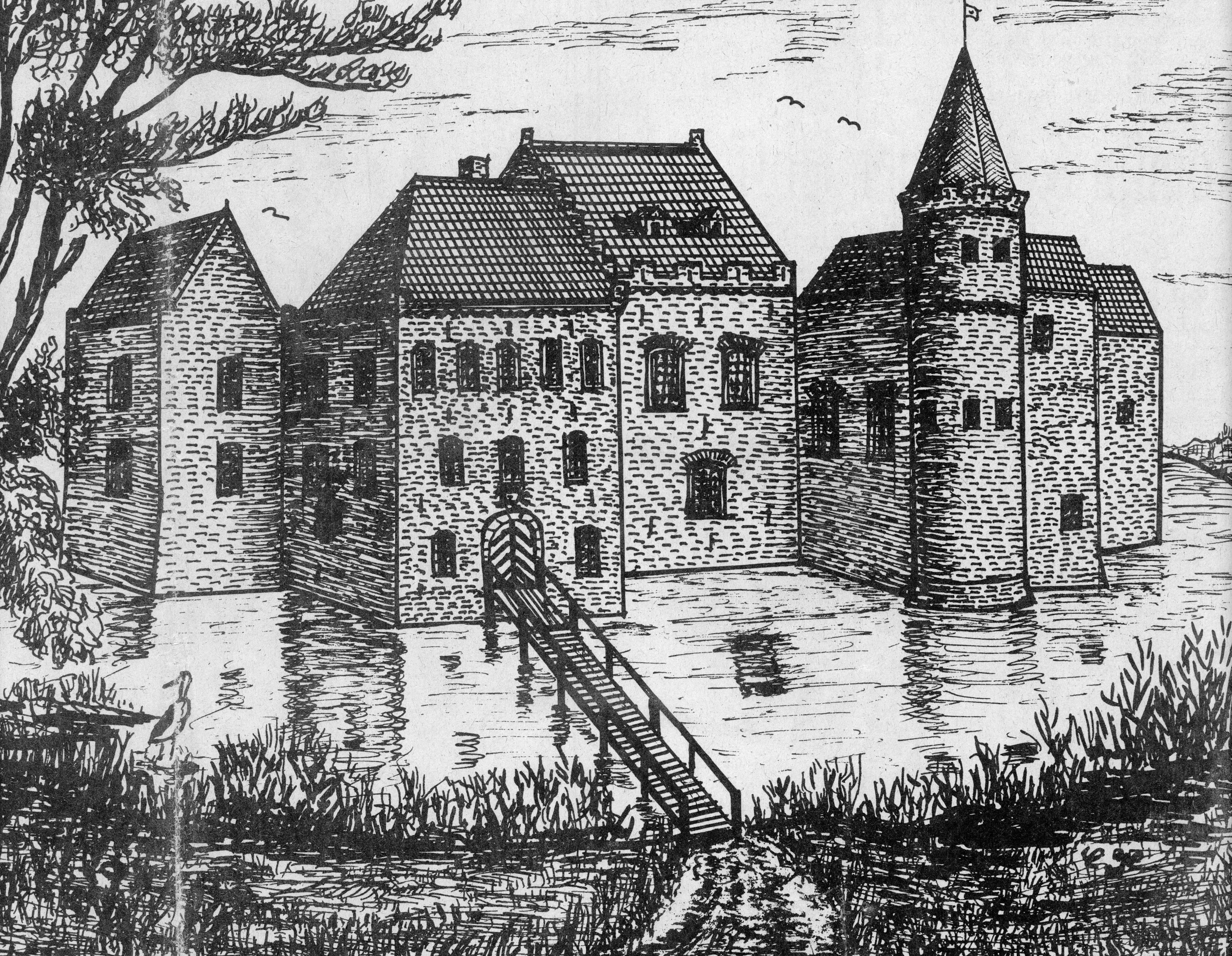 Zo moet het Slot Herlaar te Ameide/Tienhoven er omstreeks 1520 hebben uitgezien. Deze reconstructietekening is gemaakt naar aanleiding van een ruwe schets uit een met de hand geschreven boek. De tekening is gemaakt door C.J. Hoogland. C.J. Hoogland