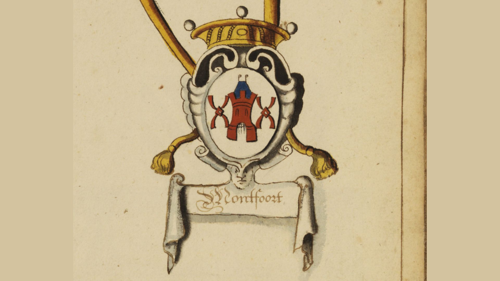 Uitlichting van rolwerkcartouches met daarop de wapenschilden van de vijf steden van Utrecht, getiteld "De Stadt ende Steden des Neder Sticht." Utrechts Archief - 1650-1670