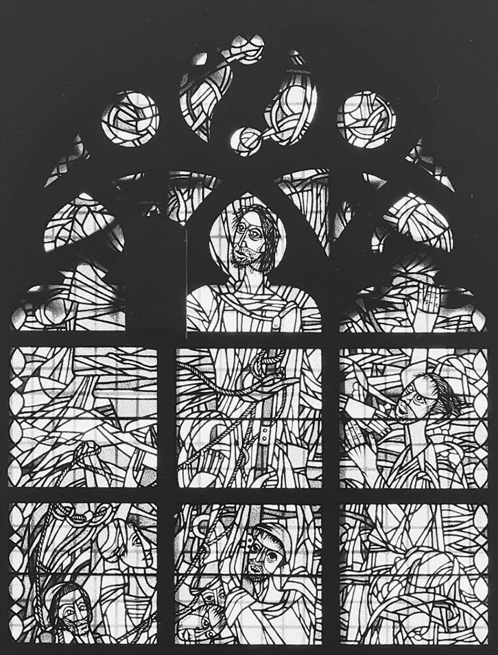 Interieur van de Nicolaïkerk, aanzicht gebrandschilderd glas-in-loodraam van Piet Kok. Rijksdienst voor het Cultureel Erfgoed - 2023 CC BY-SA 4.0