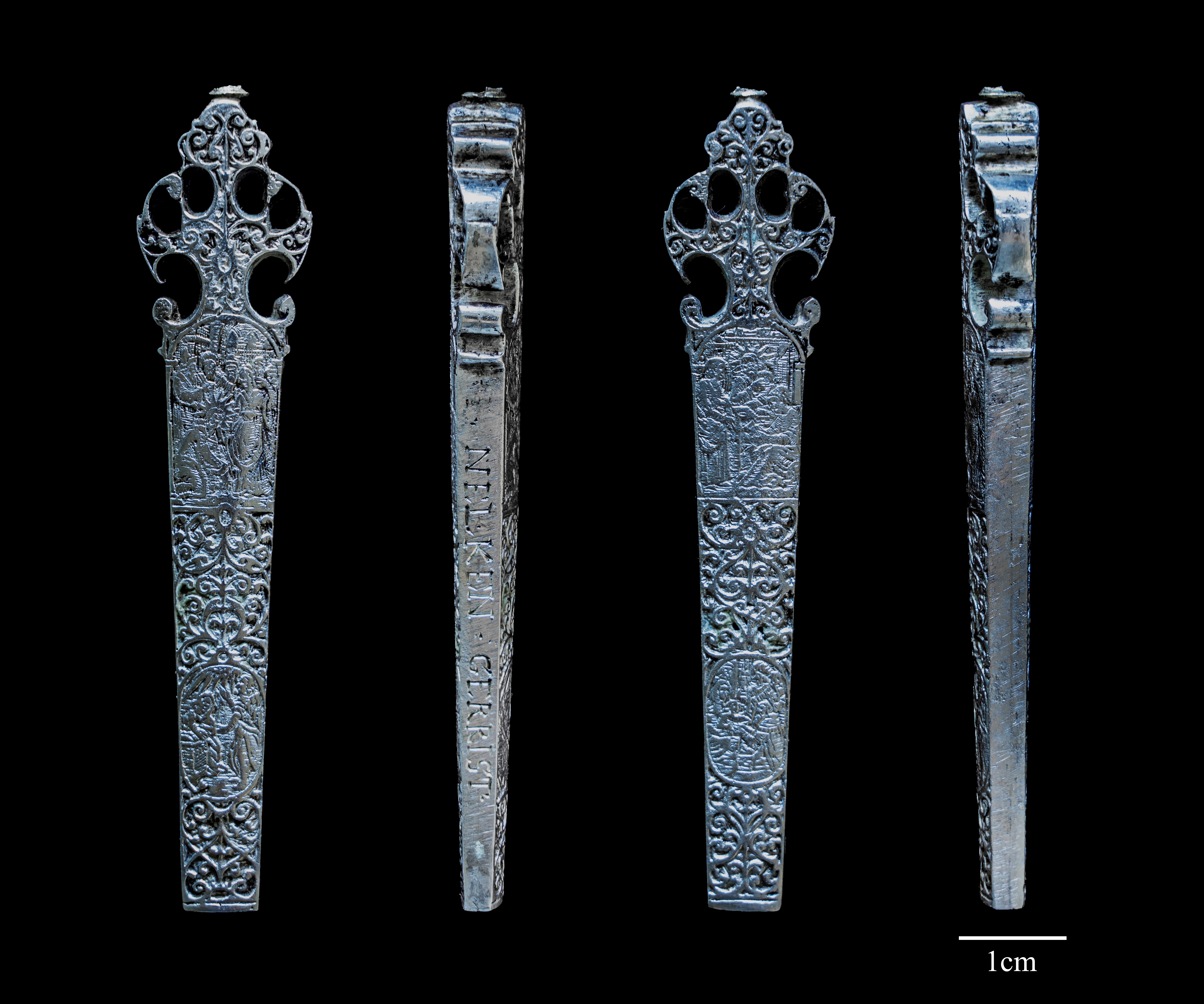 Het heft is zowel een prachtig staaltje zilversmeedwerk als graveerwerk. Welke zilversmid het heft heeft gemaakt is niet bekend, door het ontbreken van zilvermerkjes. Op de paneeltjes op het heft zijn aan beide zijden elk twee voorstellingen te zien en op de zijkant staat de naam NELKEN GERRIST. Deze Nelken lijkt afkomstig uit Zaltbommel, geboren op 4-8-1626. Ze zal dan zo rond 1650 zijn getrouwd en dat komt goed overeen met de ouderdom van het heft, het gaat hier namelijk om een bruidsgift.