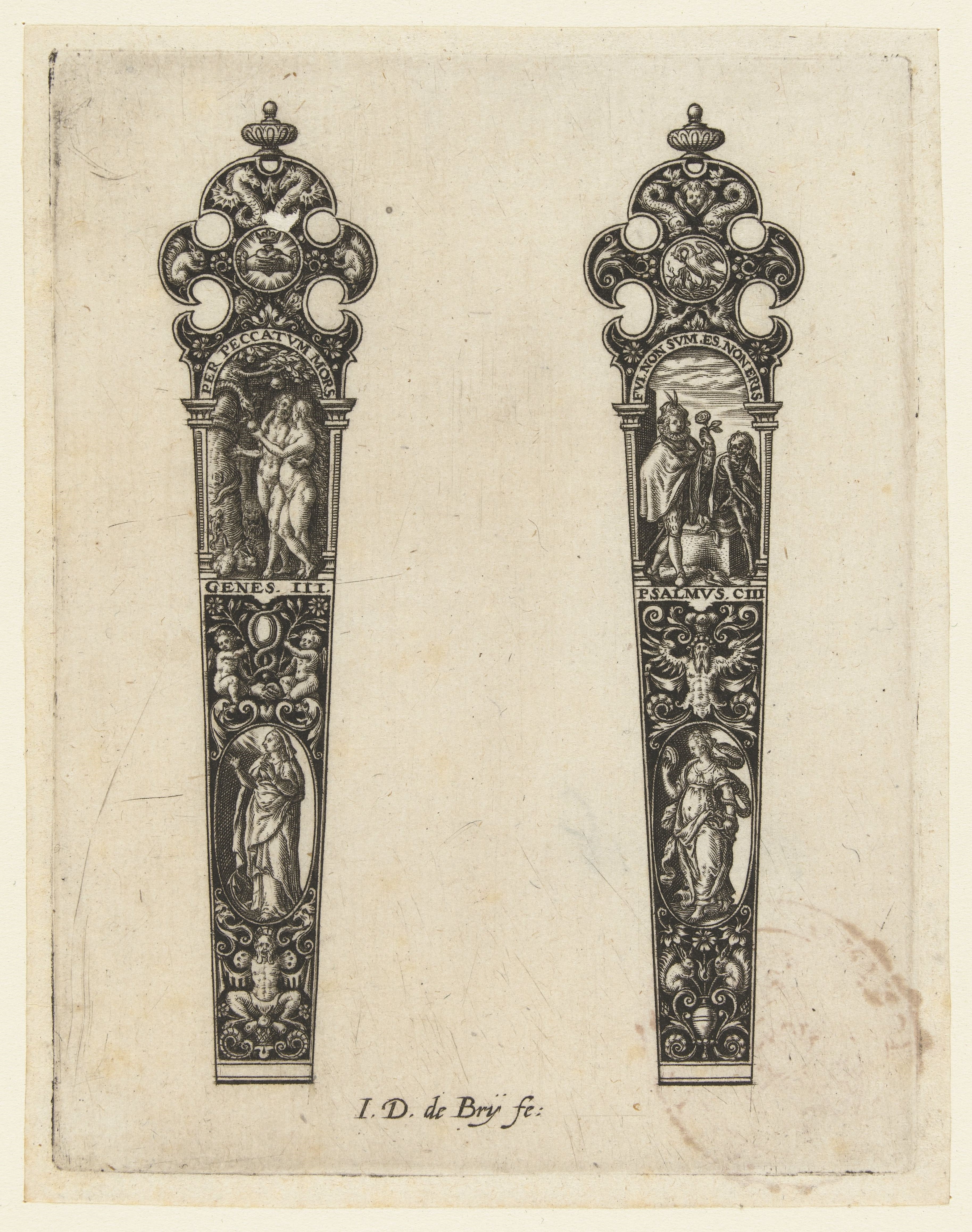 Een zilveren vork- of mesheft met Bijbelse voorstellingen