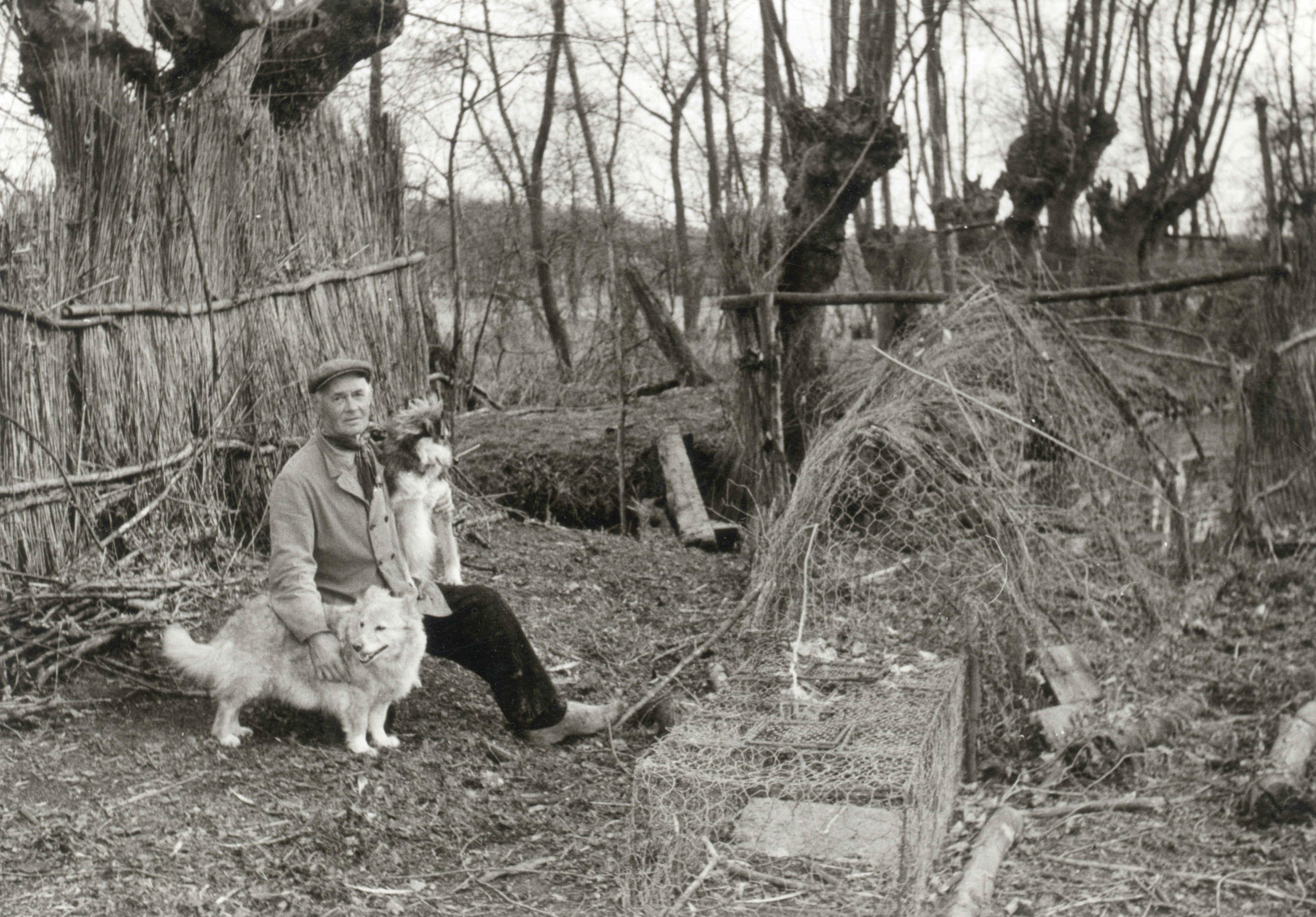 De heer C. van der Kleij met zijn twee kooikershondjes bij de eendenkooi op het land van de boerderij Rijneveldsche Bosch (Thematerweg 4) te Haarzuilens (gemeente Vleuten-De Meern). Versteeg, J.P.M., fotograaf / 89599/ collectie Het Utrechts Archief - 1960 CC BY 4.0