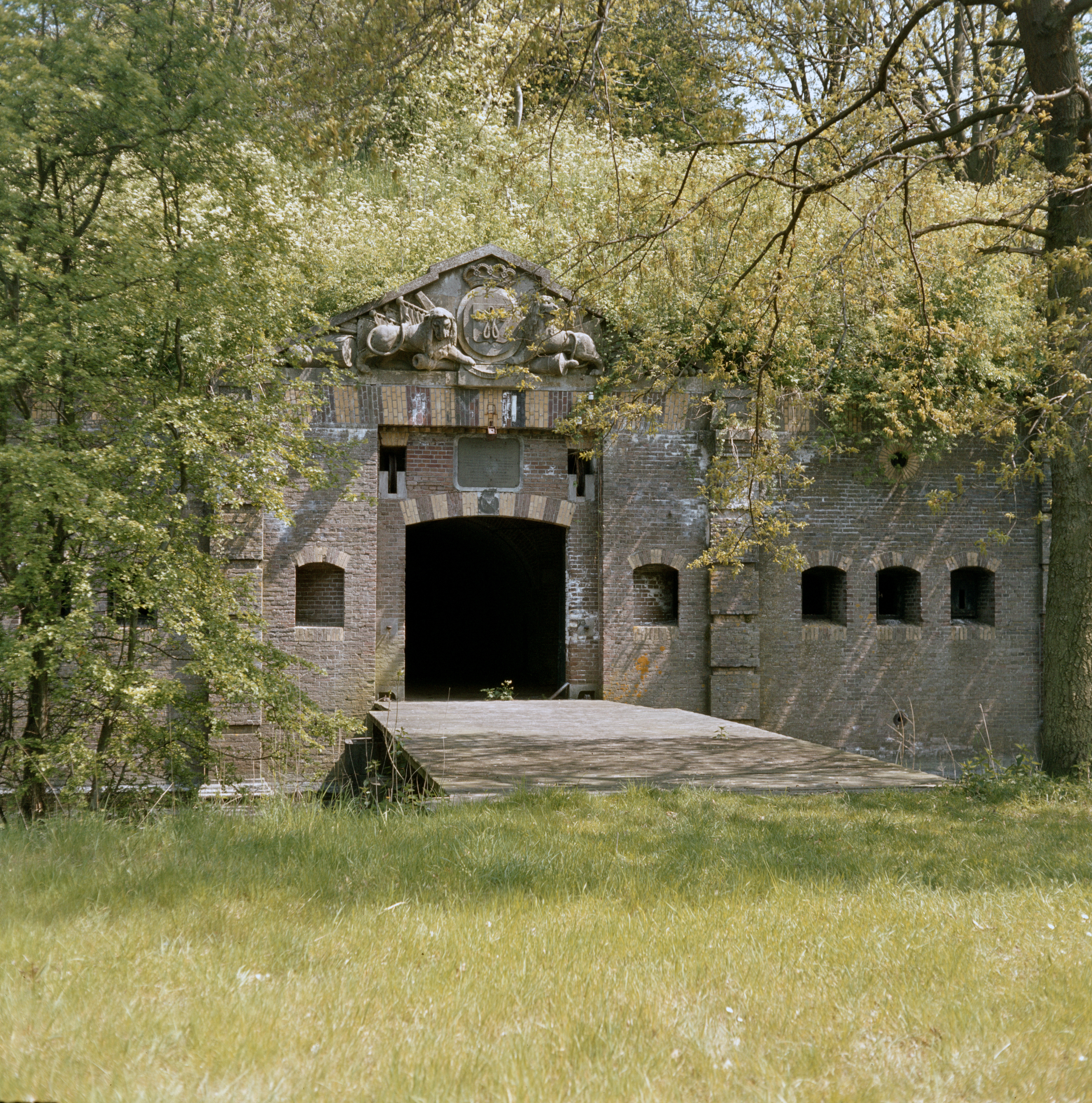 Luchtfoto van het fort Honswijk aan de Lekdijk te Tull en 't Waal (gemeente Houten), uit het zuiden. Op de voorgrond de rivier de Lek. Fotodienst HUA, fotograaf / 85674 / collectie Het Utrechts Archief - 2001 CC BY 4.0