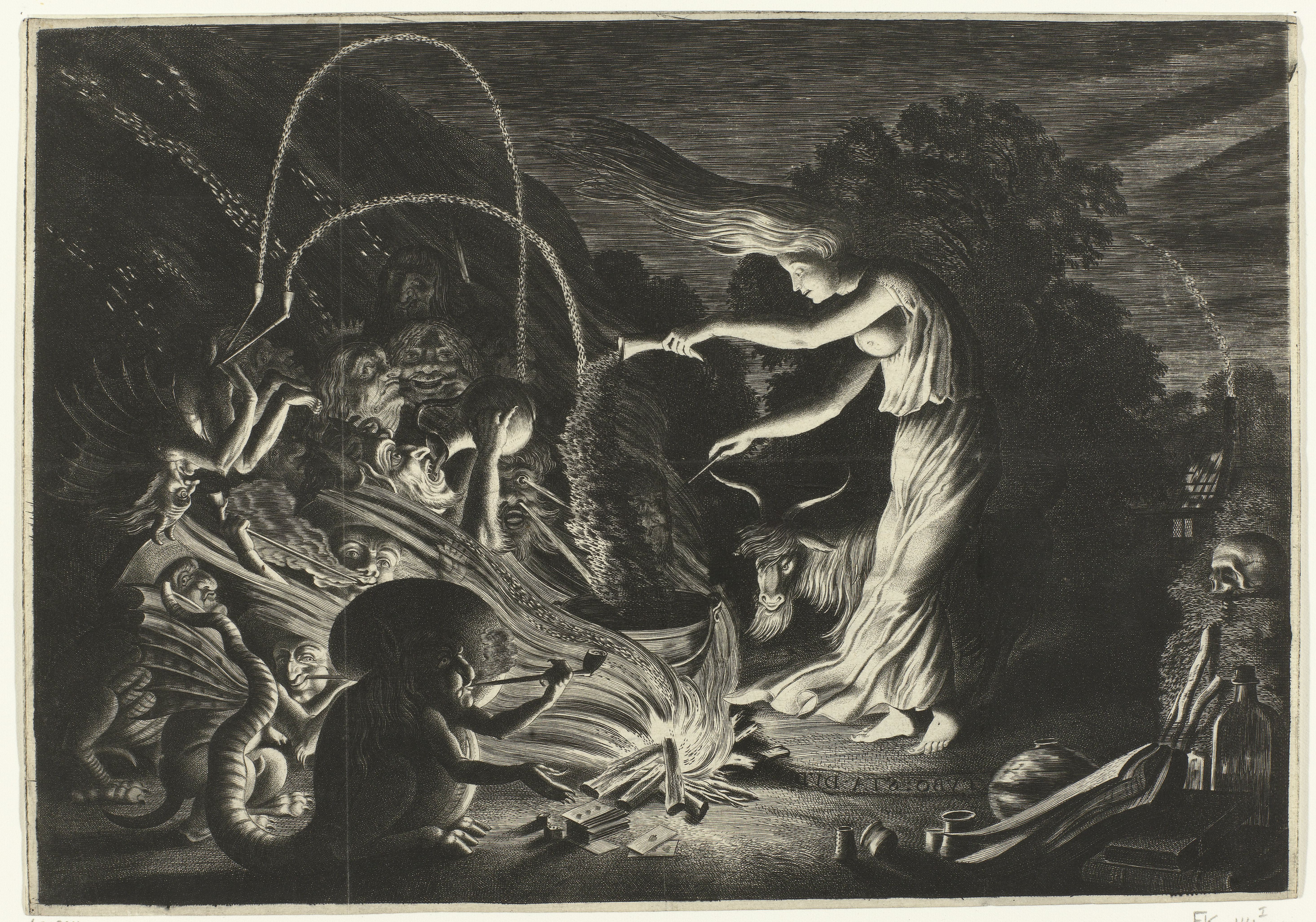 Een heks bij een kookpot waar zij poeders in giet. Er waait een harde wind. Voor haar een groep monsters. Jan van de Velde (II) / collectie Rijksmuseum - 1626 CC0