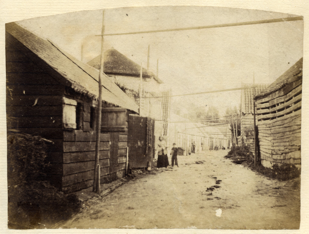 Gezicht in de Wijngaardstraat (meest noordelijke gedeelte) met boerderij en arbeiderswoningen te Oudewater uit het noorden; met in het midden een lijnbaan voor de touwfrabricage E.C. Rahms / 220918/ collectie Het Utrechts Archief - 1865 Publiek Domein 1.0