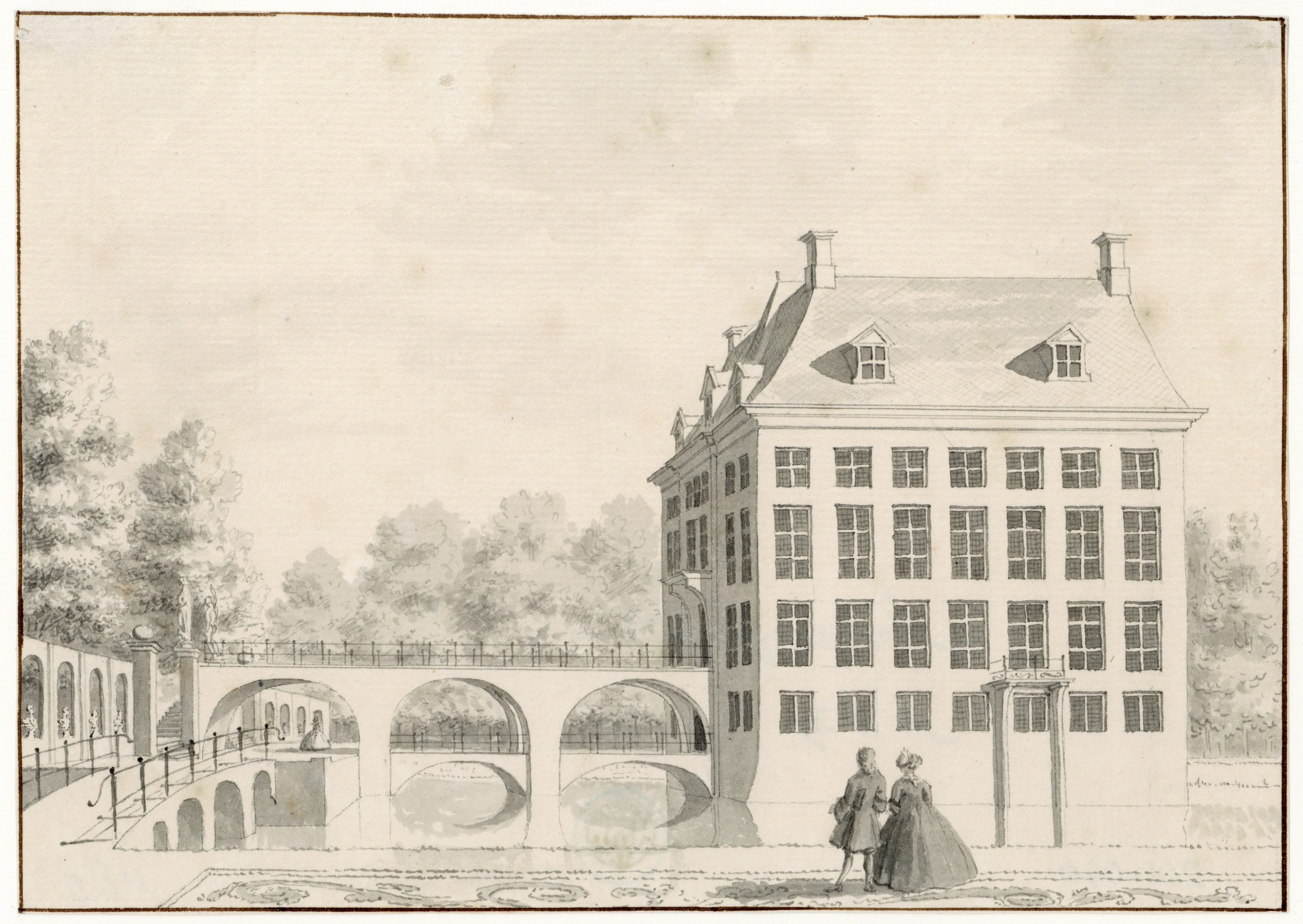 Gezicht op het kasteel vanaf de enveloppe / het eiland, langs de parterre de broderie en een stel kijkend naar het kasteel (1732). L.P. Serrurier / Het Utrechts Archief / nr: 201070 - 1732 Publiek Domein 1.0