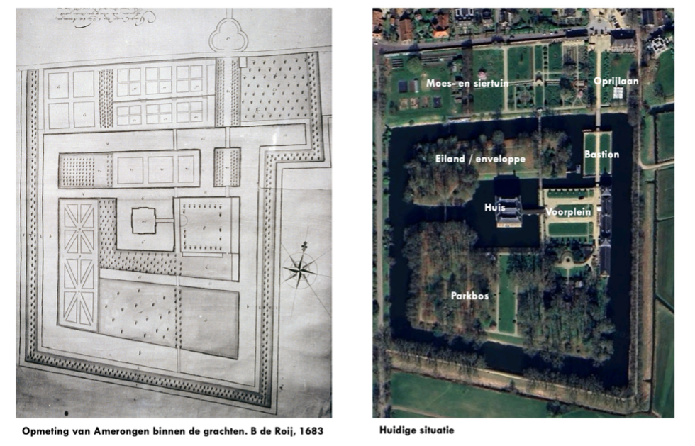 De eerste plattegrond van de situatie na de herbouw is de landmeterskaart van Bernard de Roij uit 1683. Daarop is ook voor het eerst het Noordereiland te zien. De gelijkenis met de opzet van het huidige kasteel en de tuin is opvallend. De tuin bestond toen grofweg uit moestuinen in het noorden, een formele route langs een bastion en een voorplein in het oosten, een bomenplantage in het zuiden en een ‘eiland’ of ‘enveloppe’ direct ten noorden van het kasteel. Een ‘enveloppe’ verwijst naar een verdedigingswerk waarlangs troepen zich konden verplaatsen. Of het een echte verdedigingsfunctie had, is onbekend. De verschillende deelgebieden zijn van elkaar gescheiden door een stelsel van grachten. Ondanks dat het kasteel geen echte verdedigingsfunctie meer had, benadrukten die grachten nog altijd de status van ridderhofstad.