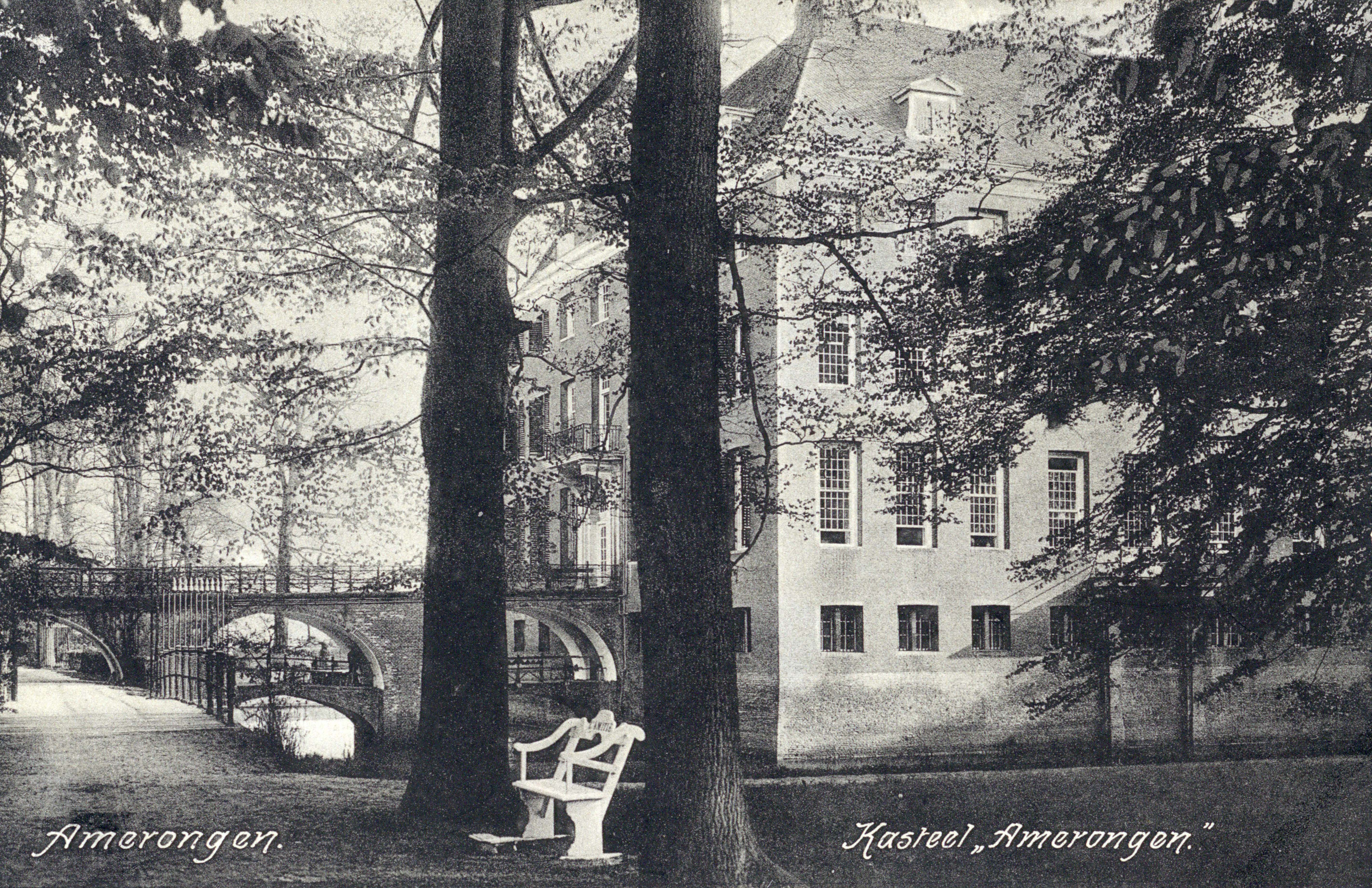 Gezicht op de voor- en rechterzijde van het kasteel Amerongen vanaf het dichtbegroeide Noordereiland (of enveloppe), ca. 1905-1915. Uitgever F.F. Kuiper / Het Utrechts Archief, catalogus nr: 7001 - 1905-1915 Publiek Domein 1.0