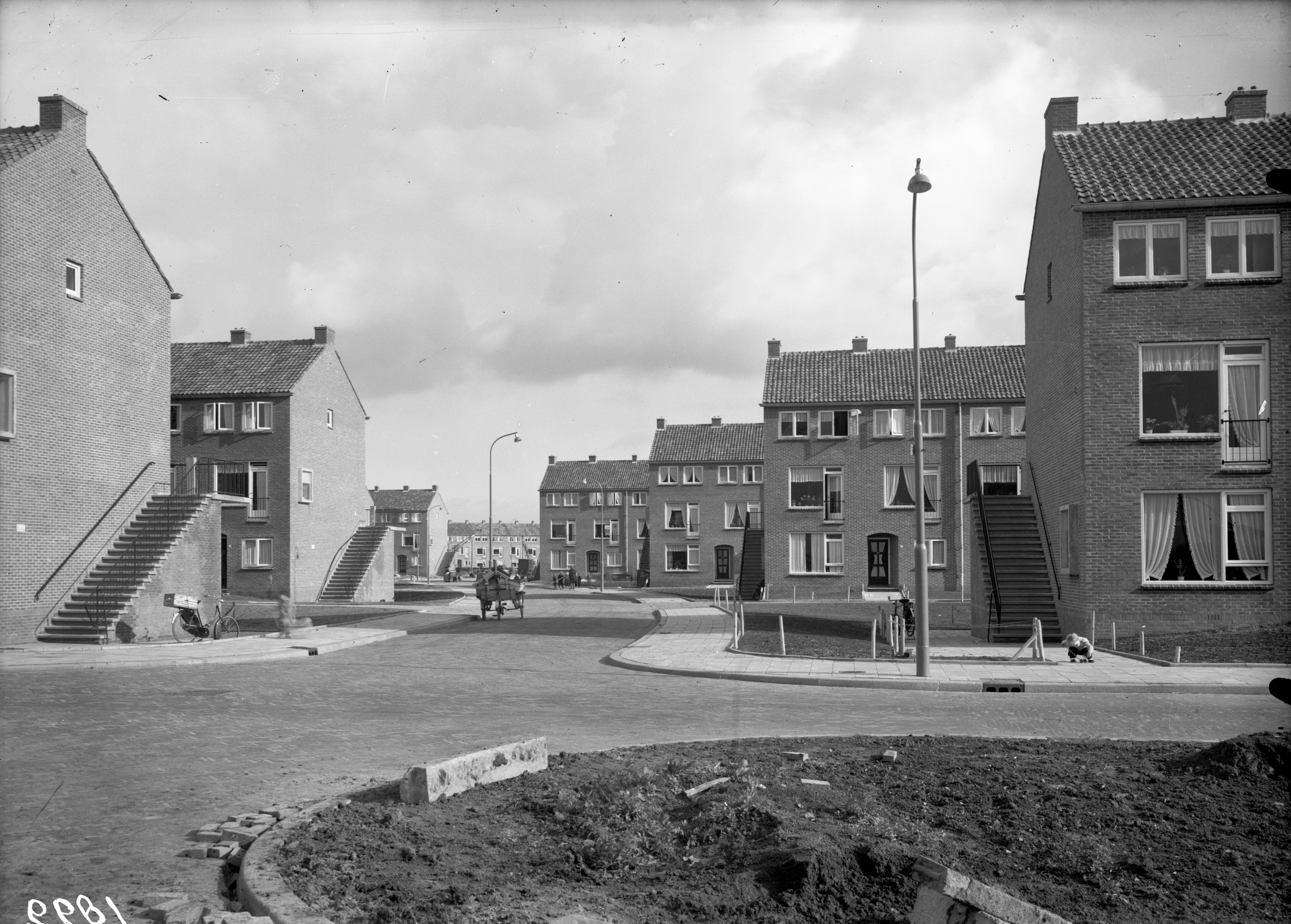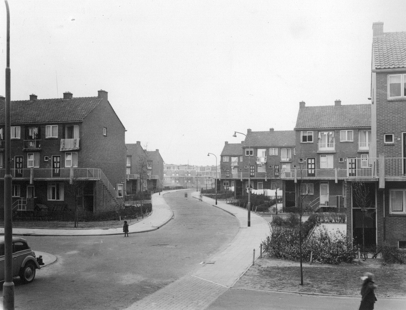 Gezicht op enkele flatwoningen aan het Spinozaplantsoen te Utrecht, met rechts de woningen nrs. 9-hoger, links de nrs. 2-hoger. Vanuit het noordoosten. Dienst Volkshuisvesting gemeente Utrecht - 1953 CC0 1.0