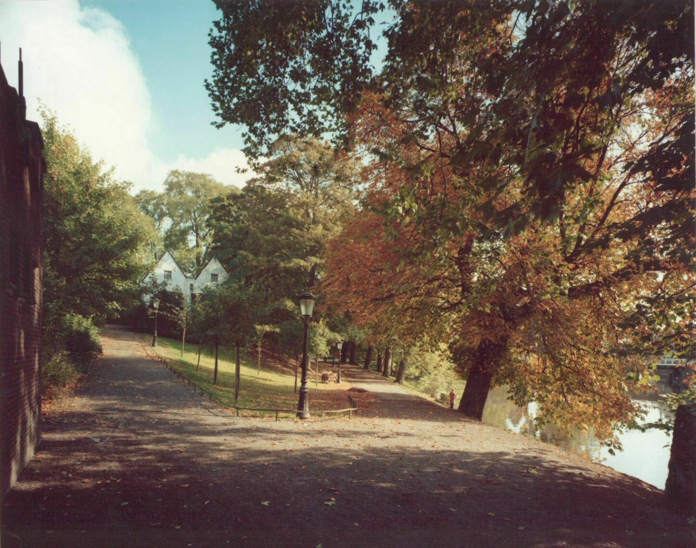 Gezicht op het plantsoen op het bolwerk Manenburg te Utrecht, uit het westen; op de achtergrond het huis Manenburg 1 en rechts de Stadsbuitengracht. Fotodienst GAU, fotograaf / 85933 / collectie Het Utrechts Archief - 1978 CC BY 4.0