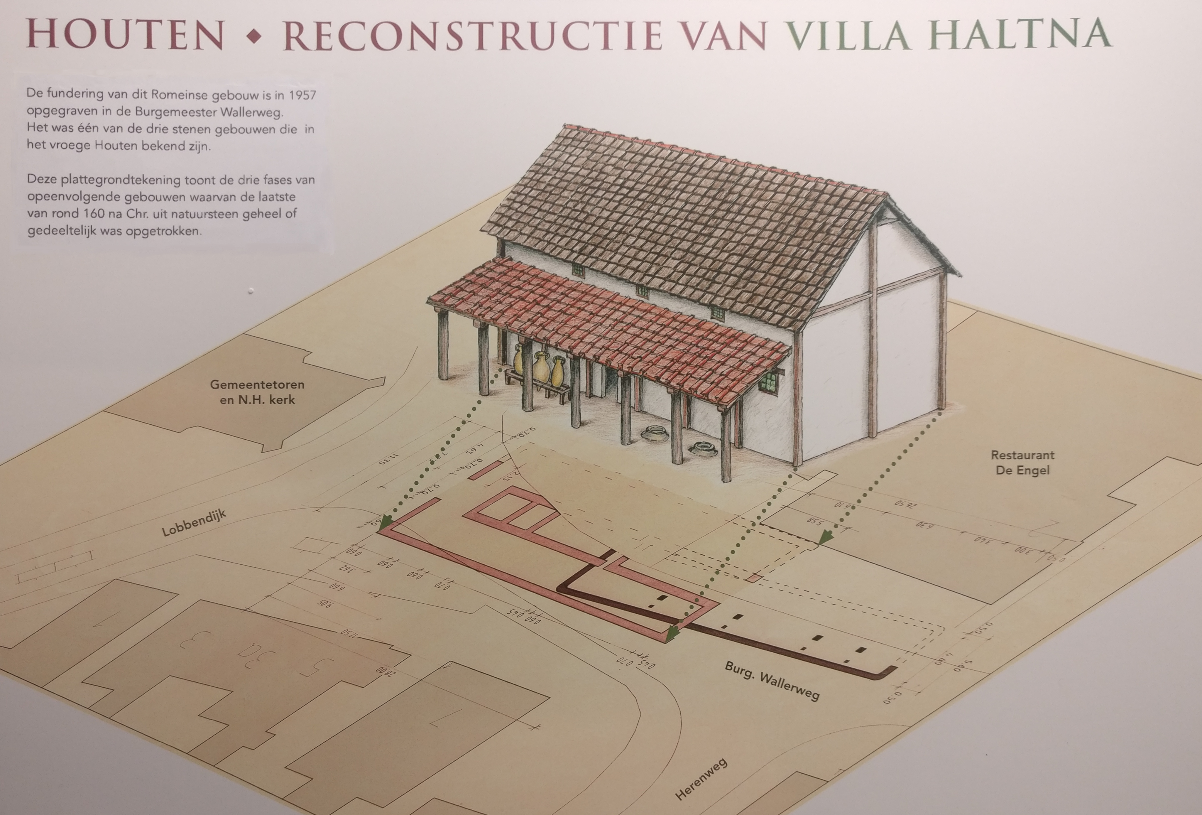 Aan de Burgemeester Wallerweg in Houten zijn in 1957 opgravingen verricht. Het terrein was al vanaf de midden-IJzertijd bewoond. In de Romeinse tijd hebben hier drie opeenvolgende gebouwen gestaan. Tussen 50 en 75 na Chr. werd de eerste houten boerderij gebouwd, tussen ca. 110 en 120 na Chr. een tweede houten boerderij en het derde gebouw werd tussen 150 en 175 na Chr. in steen opgetrokken. Mogelijk houden de nederzettingssporen verband met de boerderij die is gevonden in Houten-Tiellandt. De fundamenten van het stenen gebouw bestonden uit Grauwackeschiefer, een steensoort die voorkomt in de Ardennen en de Eifel, met daarop een tufstenen opbouw. De boerderij mat ongeveer 25 bij 4 meter, maar was misschien nog langer. De archeologen konden dit vanwege de omliggende bebouwing niet verder onderzoeken. De binnenvloer was bedekt met rood gekleurd cement, opus signinum. Aangetroffen fragmenten van een hypocaustum bewijzen dat het huis beschikte over vloerverwarming. De vensters waren vermoedelijk van glas voorzien. Aan de noordkant van het huis bevond zich mogelijk een porticus, een zuilengalerij. Het is niet uitgesloten dat het gebouw ook een verdieping had. Wandschilderingen, pleisterwerk, tufsteen, vloerbeton, tubuli, veel dakpannen en vensterglas maken het beeld compleet van een luxe gebouw dat het meest doet denken aan een eenvoudige Romeinse villa. Het gebouw kan ook een badhuis zijn geweest. Er zullen dan ook andere gebouwen in de omgeving hebben gelegen, maar daarnaar kan voorlopig geen onderzoek worden verricht. De resten liggen namelijk precies onder de bebouwde dorpskern. René Voorburg - 2018 CC BY-SA 3.0