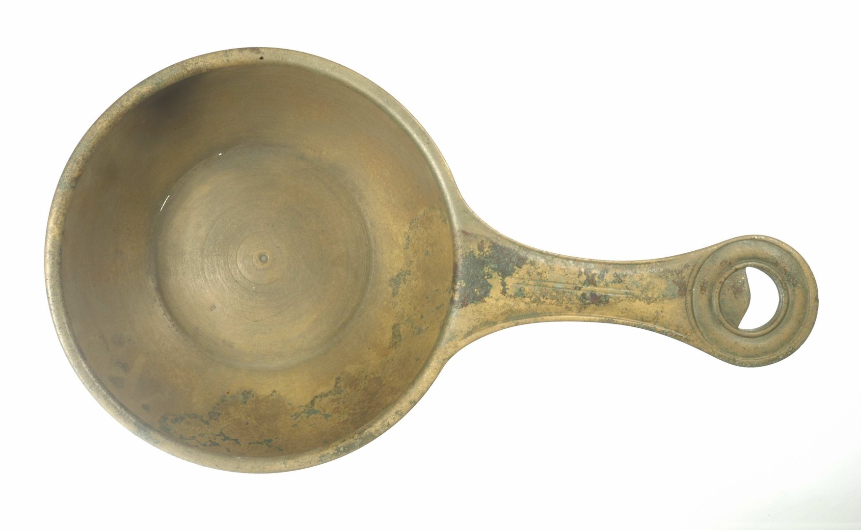 Lage casserolle op gedraaide voet. Vrijwel geheel goudkleurig, op enkele vlekjes patinering na. Op overgang van bodem naar wand enkele haarscheurtjes. Bodem is voorzien van zware ribbels. De komvormige schaal loopt uit in een naar buiten wijkende lip. Het platte handvat loopt uit op een ronde schijf en is voorzien van een halve-maanvormig gaatje. Vervaardigd in Gallië. Rijksmuseum van Oudheden - 35-85 na Chr. CC BY