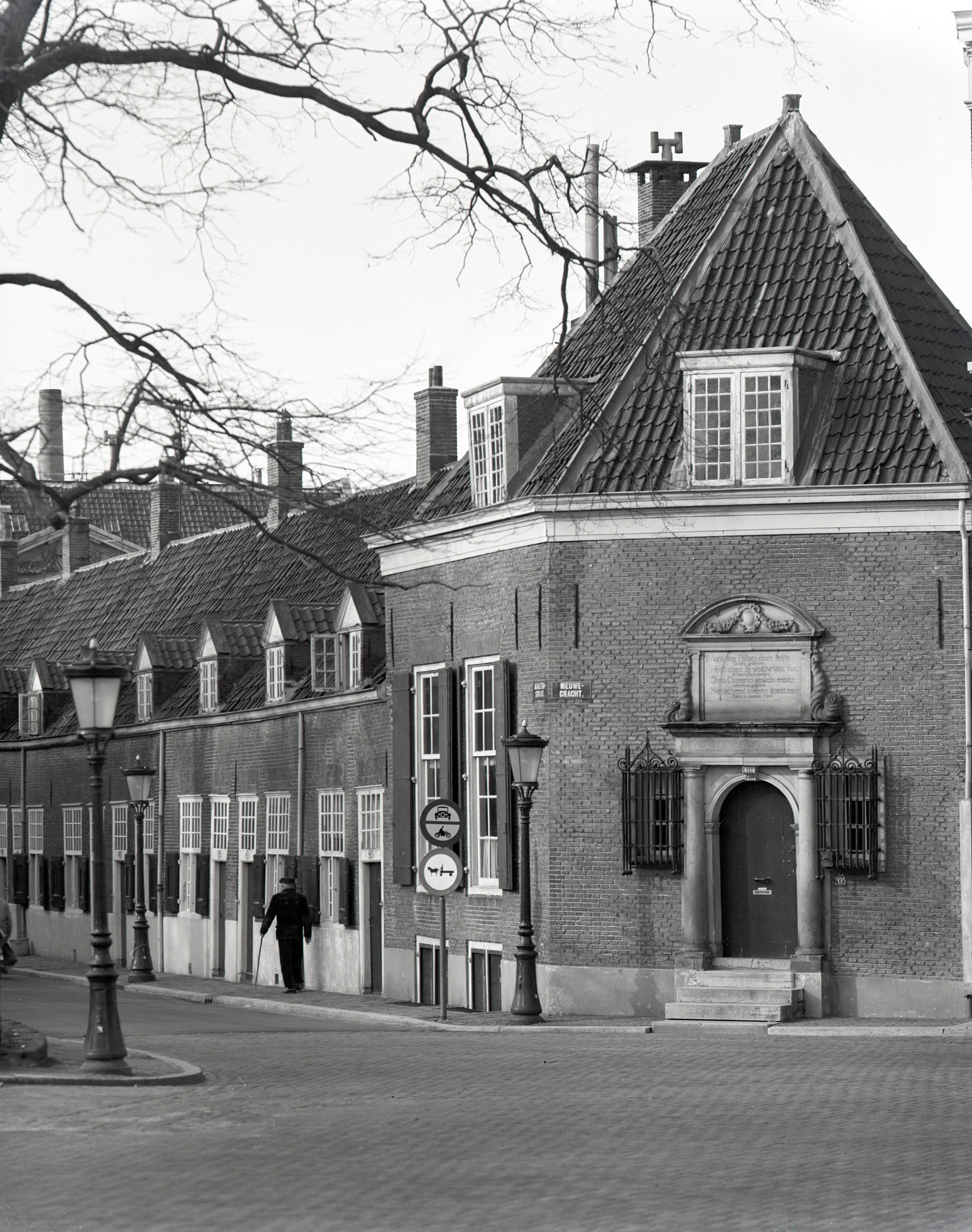 Gezicht op de vrijwoningen van de Fundatie van Maria van Pallaes (Agnietenstraat 8-30) te Utrecht, met rechts het Refectiehuis (Nieuwegracht 205). Fotodienst GAU / 400277 / collectie Het Utrechts Archief - 1975 CC BY 4.0