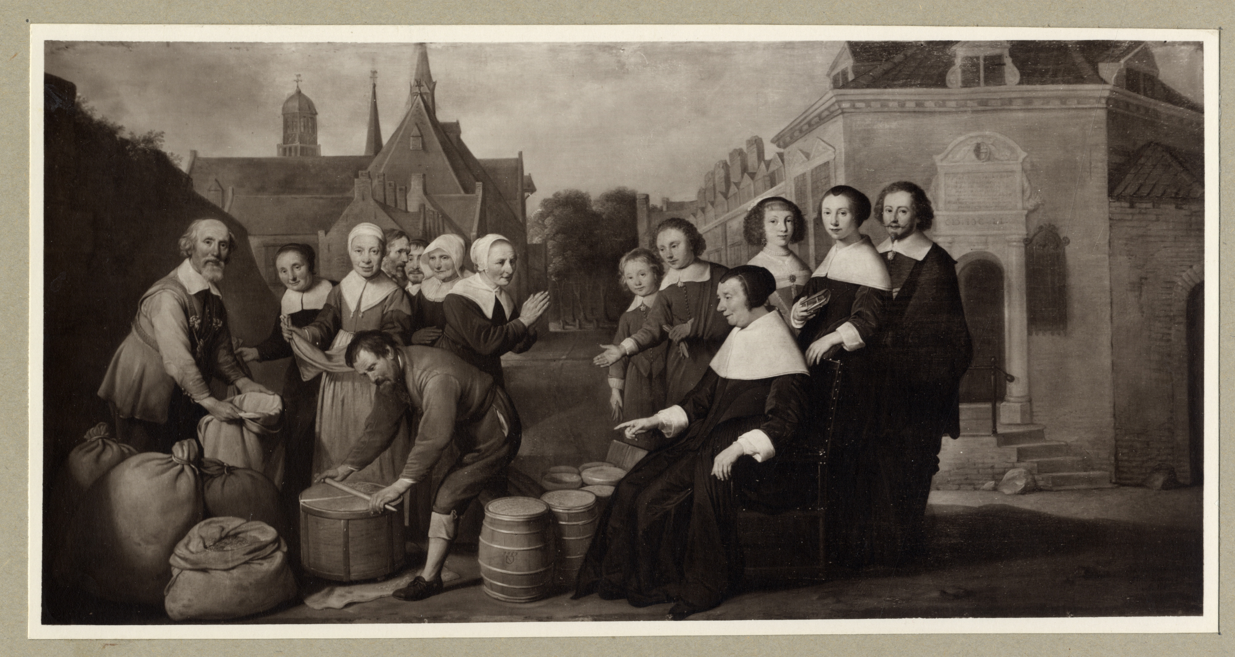 Portret van Maria van Pallaes, geboren 1587, echtgenote van H. van Schroyestein, stichteres van vrijwoningen van de Fundatie van Maria van Pallaes (Agnietenstraat 8-30) te Utrecht, overleden 1664. Ten voeten uit links, zittend, met achter haar, staand, vijf van haar zes kinderen, tijdens de jaarlijkse voedseluitdeling aan de armen. Op de achtergrond de Agnietenstraat met links het Agnietenklooster en rechts de door haar gestichte vrijwoningen. A. Frequin (schilderij van Hendrick Bloemaert) / 106023 / collectie Het Utrechts Archief - 1657 Publiek Domein 1.0
