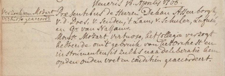 In 1763 schrijft Leopold Mozart, de vader van de wereldberoemde componist Wolfgang Amadeus, in een brief: ‘… maar laat ik u één ding verzekeren: we gaan niet naar Holland. Wel twee of driehonderd dukaten kan ik daar verdienen, zo hoor ik van iedereen, maar ik besef maar al te goed dat het schrikbarend hoge kosten met zich mee zou brengen. En die Hollanders, het gewone volk, maar ook de rest, hebben weinig niveau.’ Op 21 april 1766 treden ze op in een zaal aan het Vredenburg.