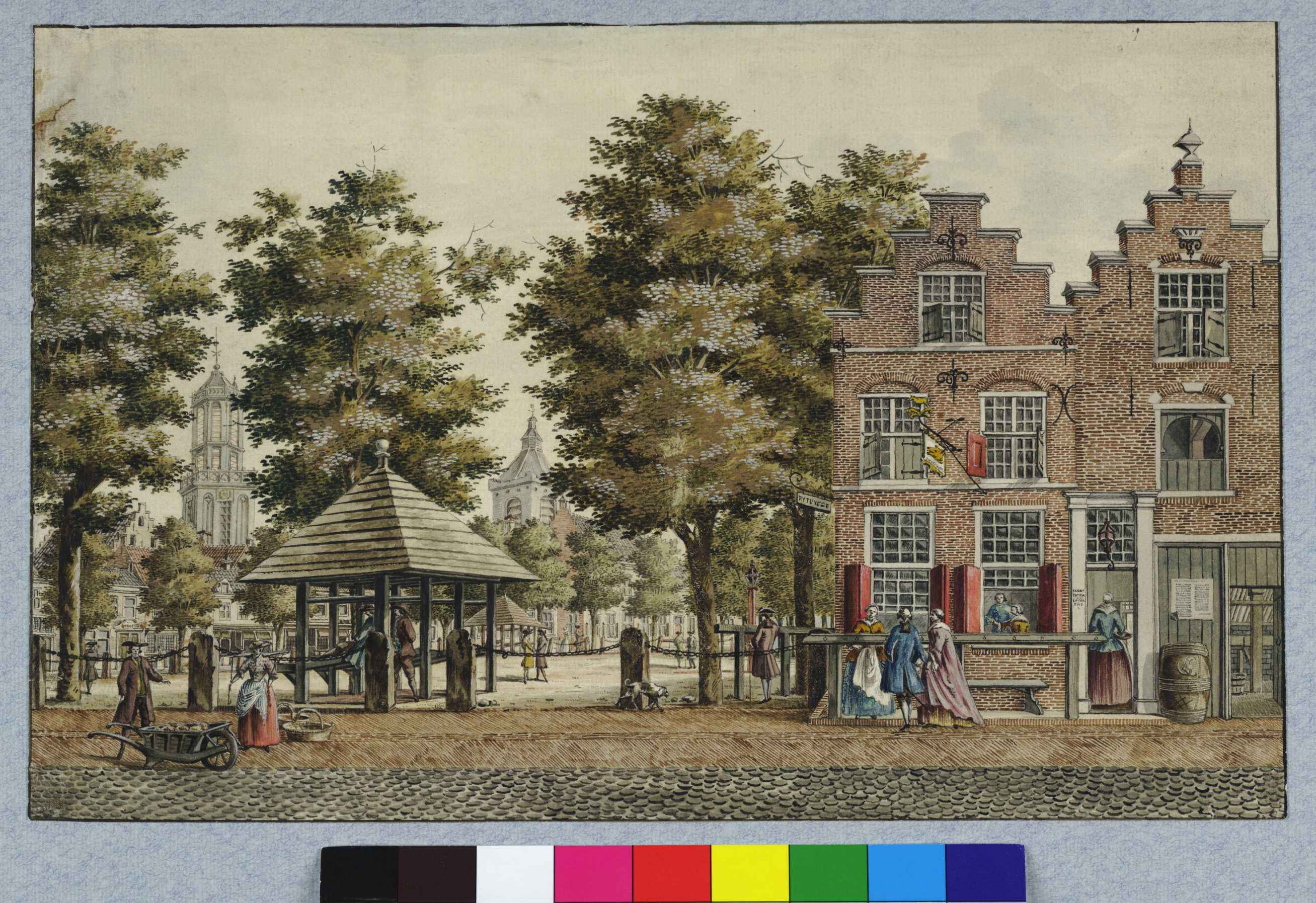 Gezicht uit het noordwesten op het Vredenburg te Utrecht met de herberg Het Zwijnshoofd en links een hoefstal, met op de achtergrond gedeeltelijk de torens van de Dom en de Buurkerk. De tekenaar stond met zijn rug naar de huizenrij aan de noordwestzijde van het plein. Verrijk, D., tekenaar / 30578 / collectie Het Utrechts Archief - 1755 - 1765 CC0