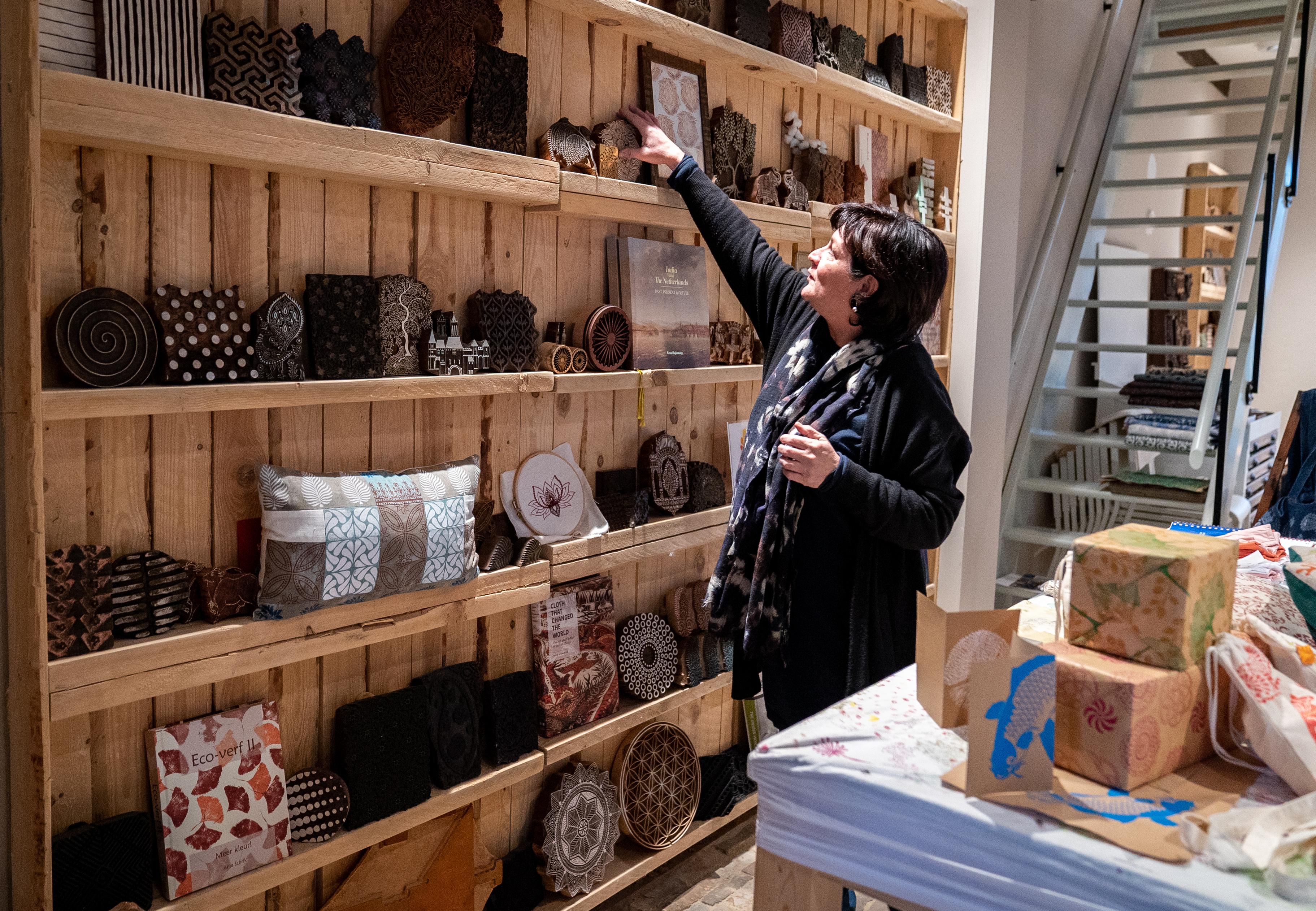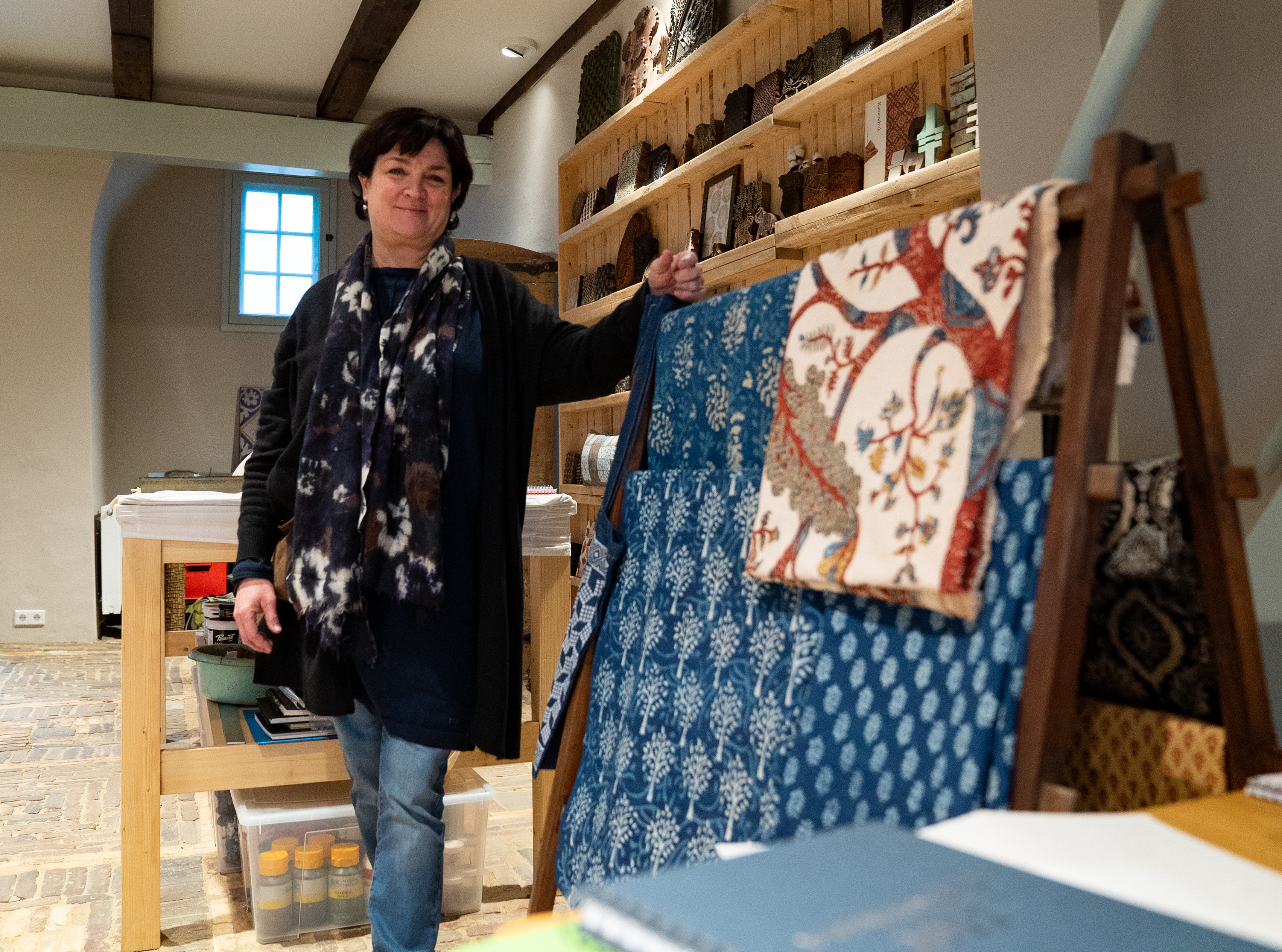 ‘Voor mij begon de interesse bij de prachtige handgeborduurde shawls uit Kashmir, die trokken me naar India. Ik ben in de leer gegaan bij ambachtslieden en ben onder meer shawls en blockprints gaan importeren. Verder geef ik masterclasses blockprinten, workshops en lezingen over de geschiedenis van textiel uit India, katoendrukken, de volmolen én de textielnijverheid in Amersfoort. Bij De Katoendrukkerij komt dat allemaal samen.’