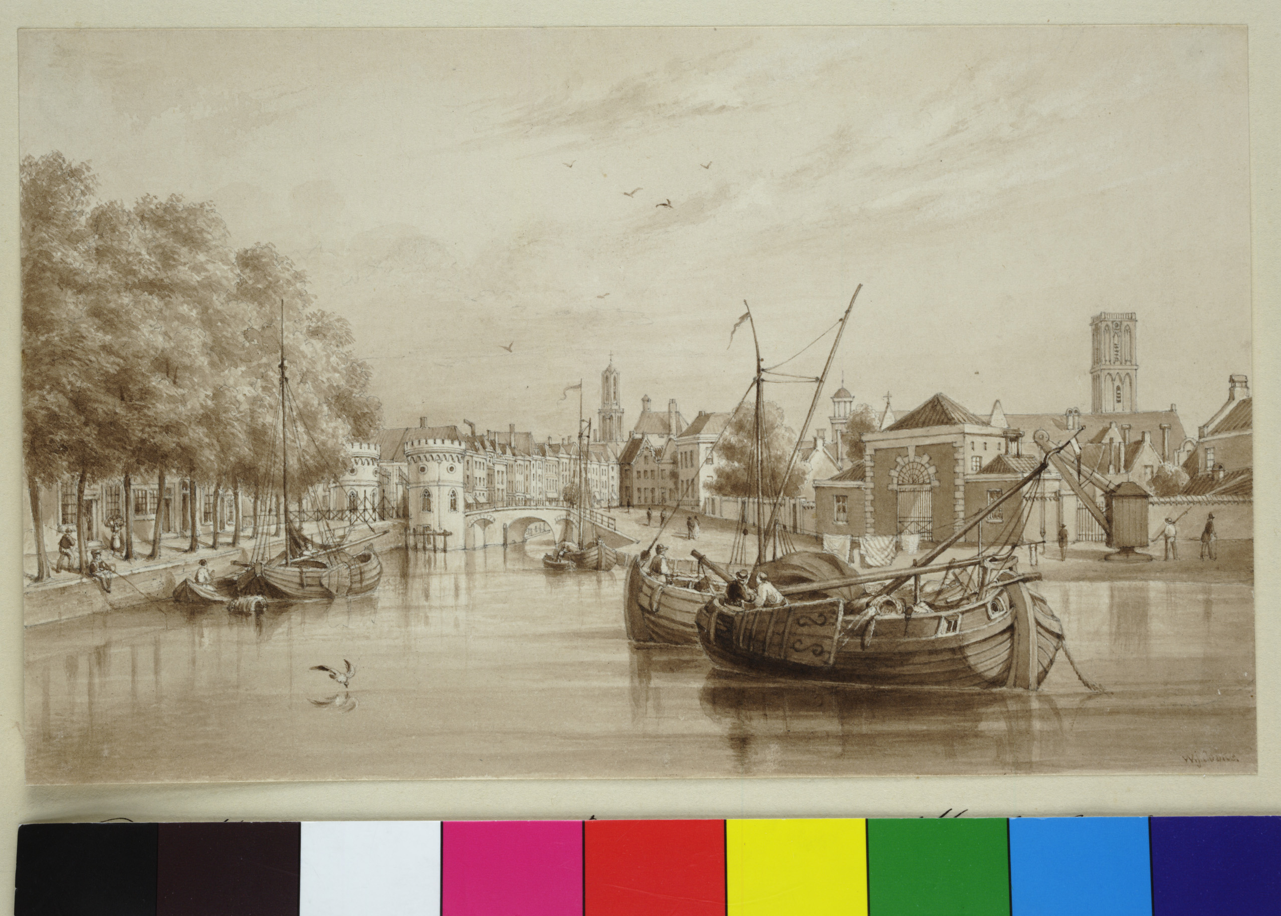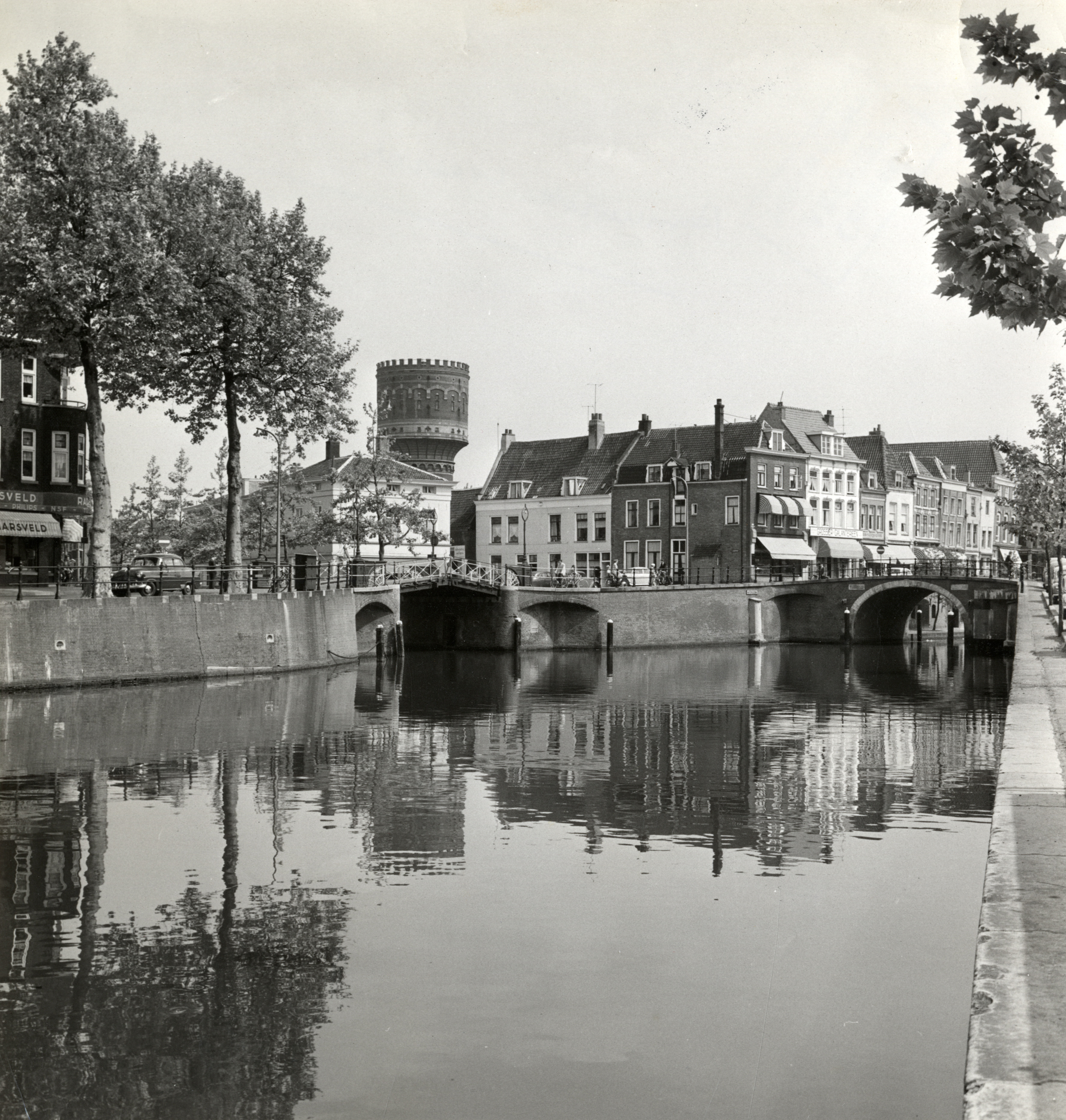 Gezicht op de Stadsbuitengracht te Utrecht, ter hoogte van de Weerdsluis, met links de Weerdbrug en rechts de Zandbrug over de Oudegracht. Op de achtergrond de watertoren aan de Lauwerhof. Kon, A.D. / 401098 / collectie Het Utrechts Archief - 1963-1986 CC BY 4.0