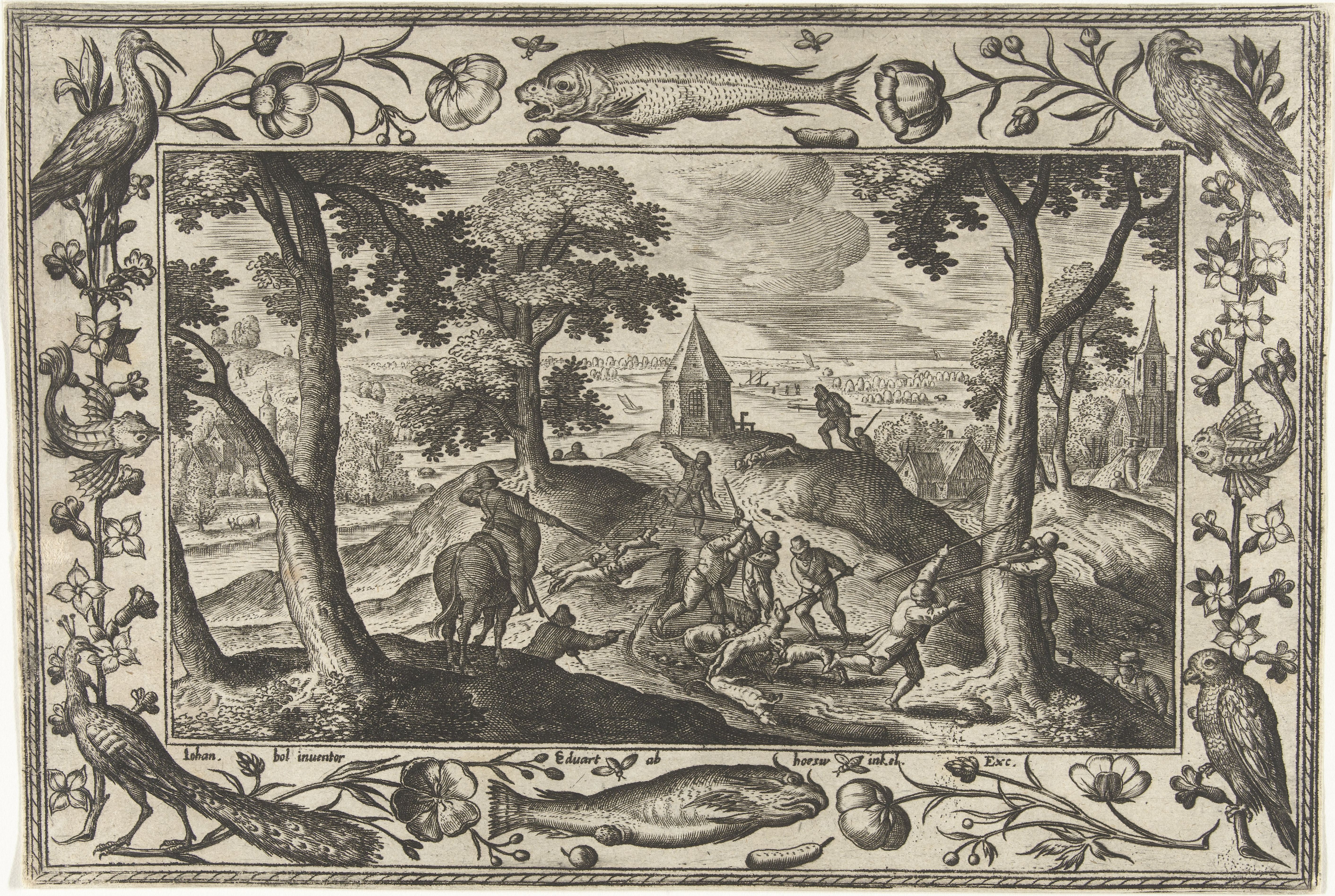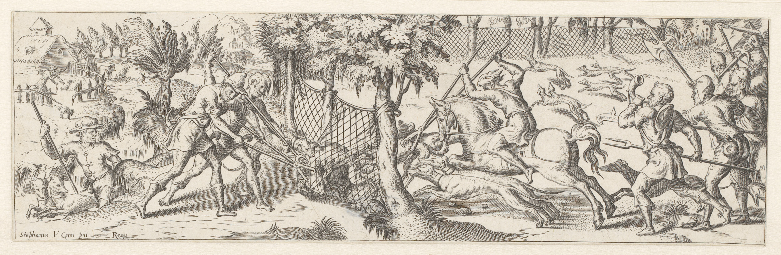 Jacht op wolven met behulp van een net Chasses a différents animaux (serietitel) Jachtscènes (serietitel) Etienne Delaune / collectie Rijksmuseum - 1528 Publiek domein 1.0