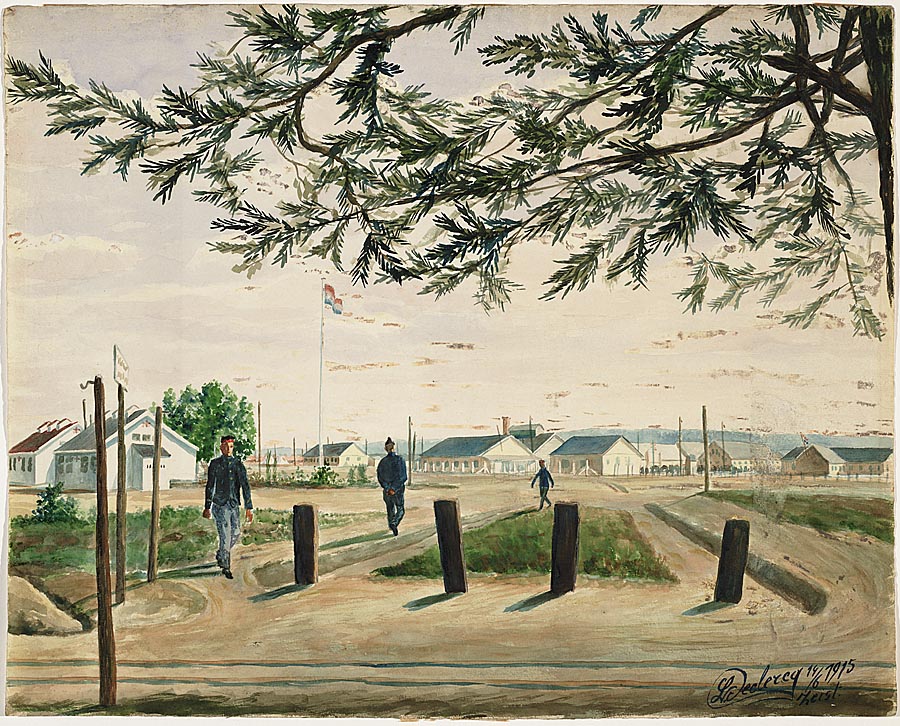 Aquarel met afbeelding van Belgische geïnterneerde soldaten in Kamp Zeist. Voorstudie: 1003-180. Declercq, L. - 1915