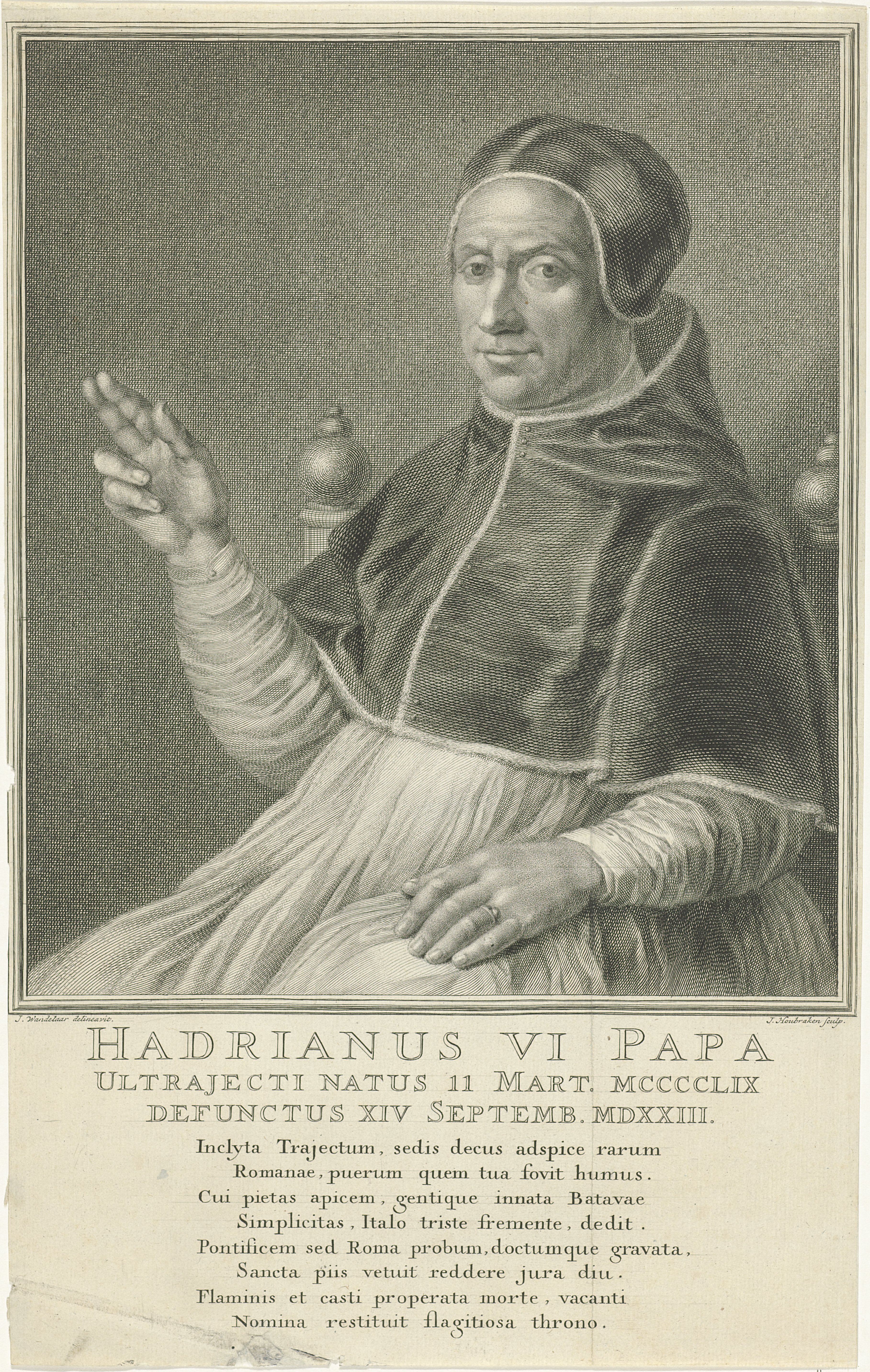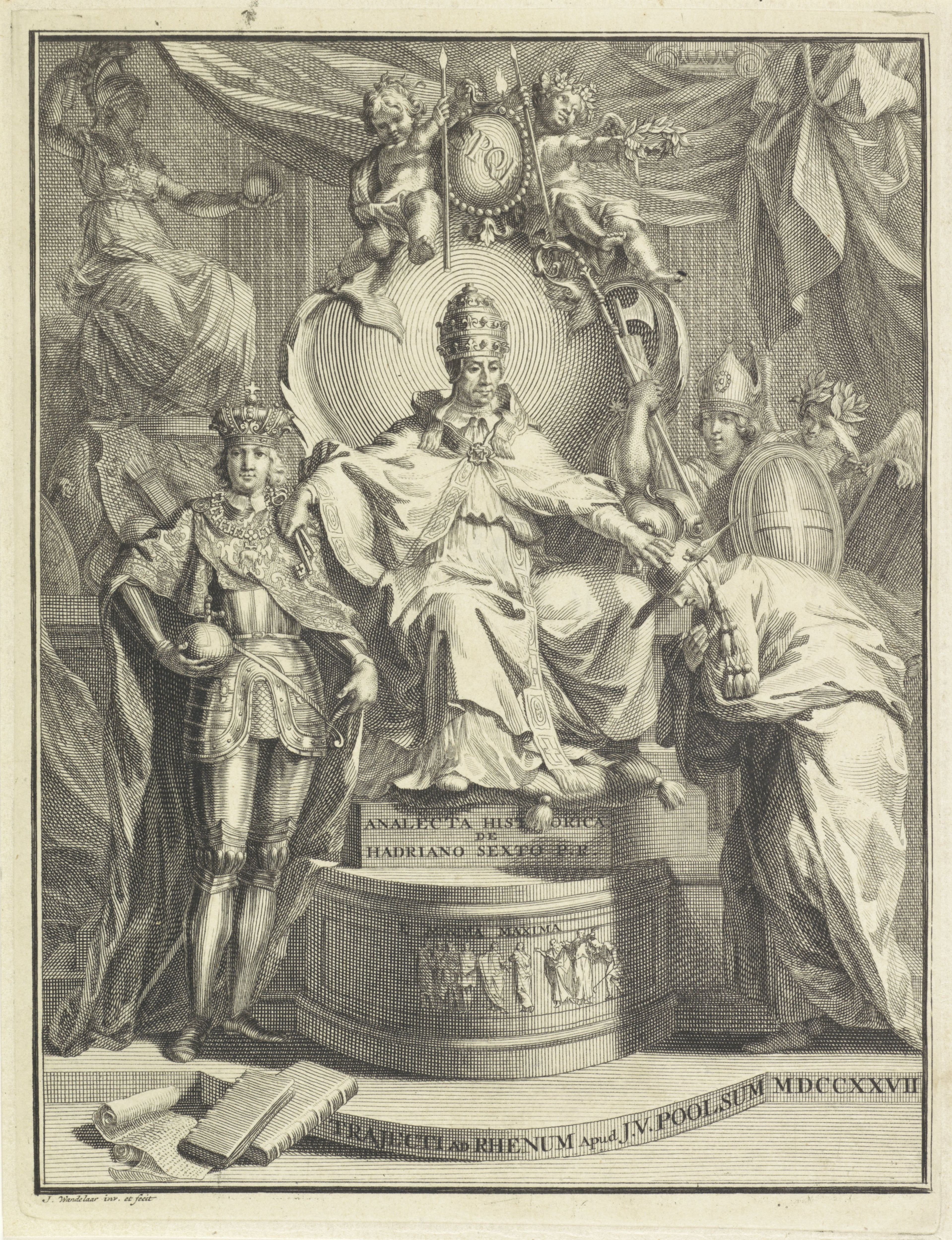 In het midden troont paus Adrianus VI. Hij draagt de tiara, de cappa magna en de sleutels van Petrus. Twee putti zitten op de rug van de troon aan weerszijden van een medaillon met de letters SPQR (Senatus PopulusQue Romanus). Linksboven zit Minerva. Rechts staat naast een engel een bisschop met een staf, fasces en een schild. Onder Adrianus' voeten staat een gedeelte van de titel van het boek en daaronder ‘E Minima [re] Maxima’, uit iets kleins komt het grote, boven enkele personen in een stoet. De rechterhand van Adrianus rust op de schouder van waarschijnlijk Karel V. De linkerhand van de paus zegent een kardinaal, mogelijk Willem van Enckevoirt. Jan Wandelaar / collectie Rijksmuseum - 1727 Publiek domein