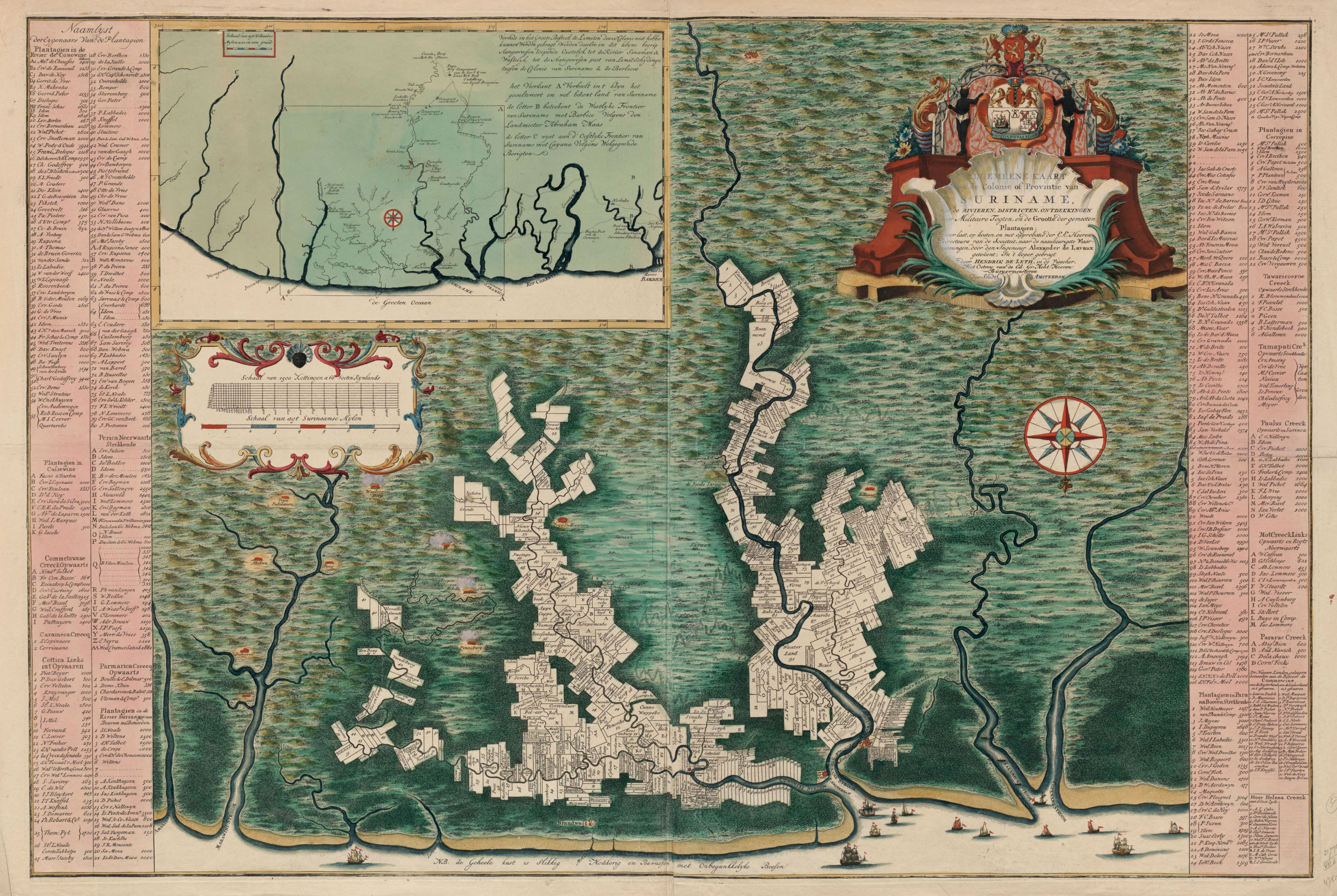 Een kaart van Suriname, met daarop de namen van de plantages zichtbaar. Getekend door Alexander de Lavaux in opdracht van de Heeren Directeurs van de Societeit. Alexander de Lavaux - 1750 Publiek Domein 1.0