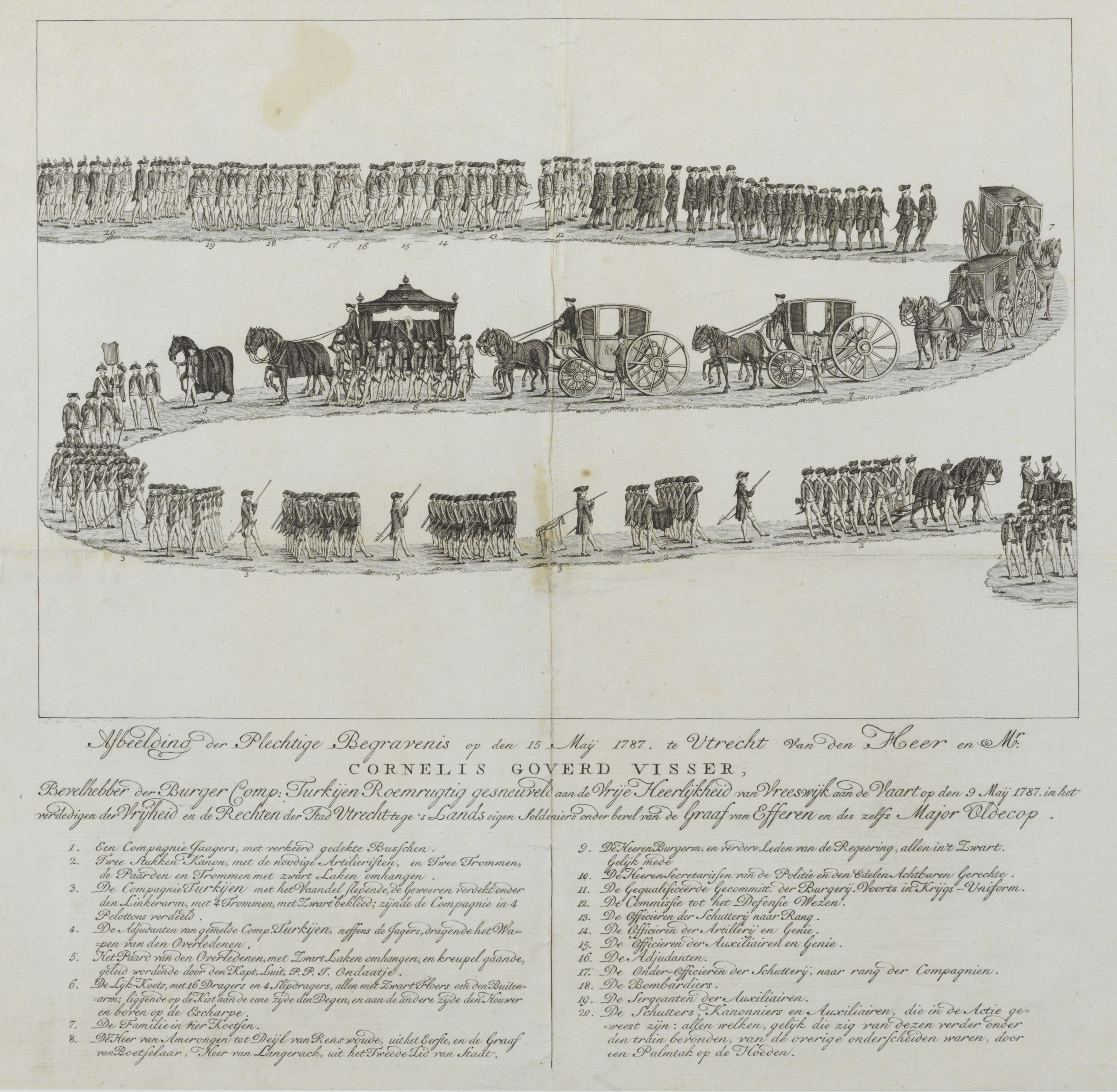 Afbeelding van de begrafenisstoet van mr. Cornelis Goderd Visscher, bevelhebber van de Utrechtse burgercompagnie Turkije, geneuveld in het gevecht aan de Vaartsche Rijn bij Vreeswijk op 9 mei 1787. Anoniem - 1787 Publiek Domein 1.0