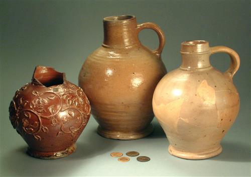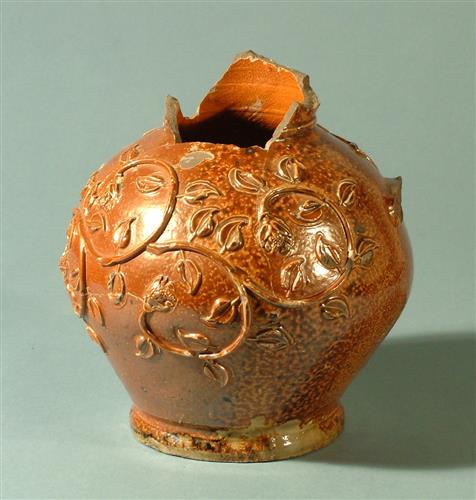 Kan of kruik versierd met opgelegde bloemenranken van bruin geglazuurd aardewerk. Het oor en een groot deel van de hals is afgebroken. Enkele (delen van) blaadjes van de versiering zijn losgeraakt en verloren gegaan. De kruik is gevonden op 19 februari 1894 in de Nieuwstraat te Amersfoort, gevuld met zilvergeld. De kruik is in februari 1966 gebroken aangetroffen in een kast door Mw. M. Heijenga en daarna gelijmd. Museum Flehite