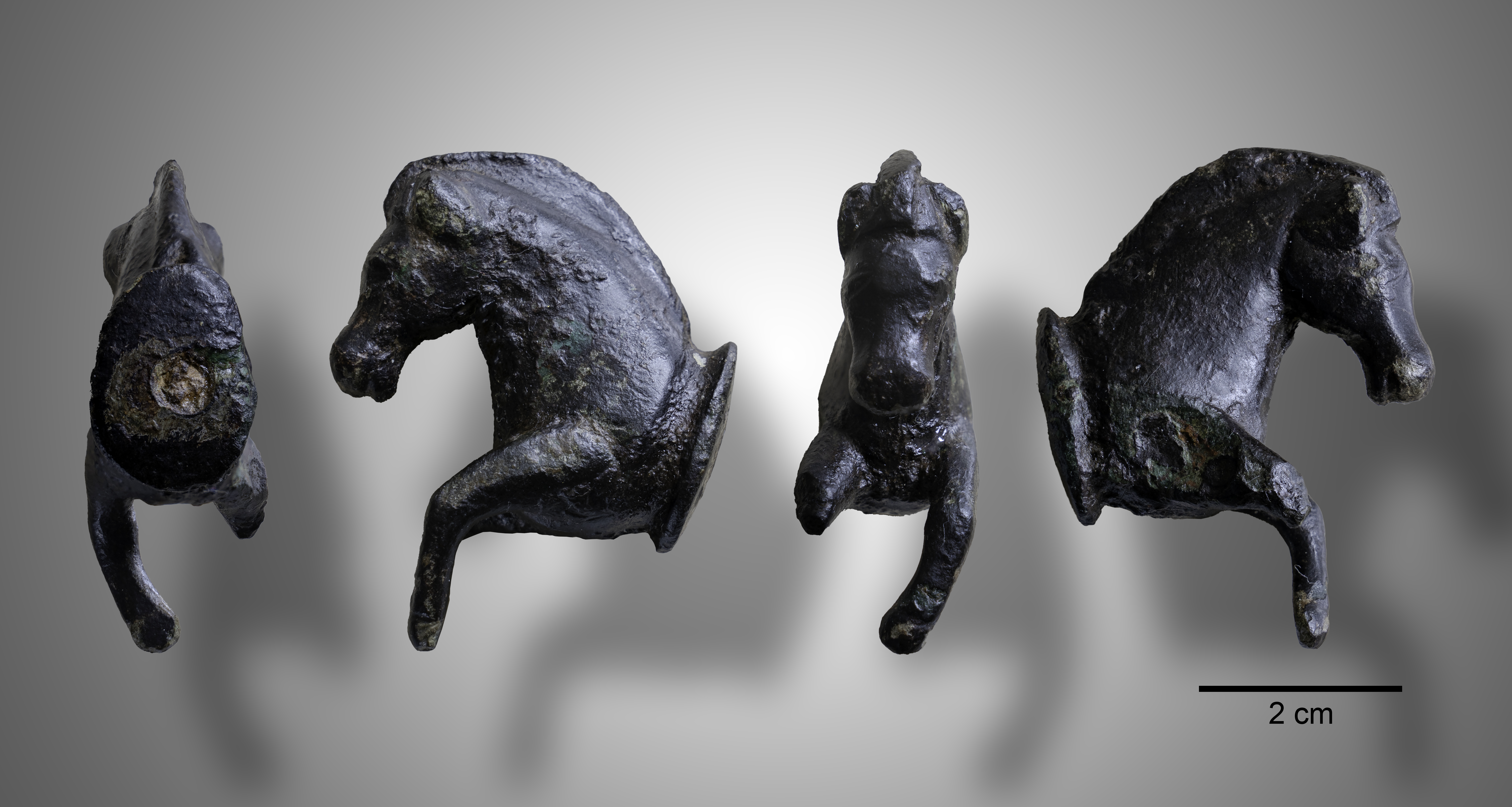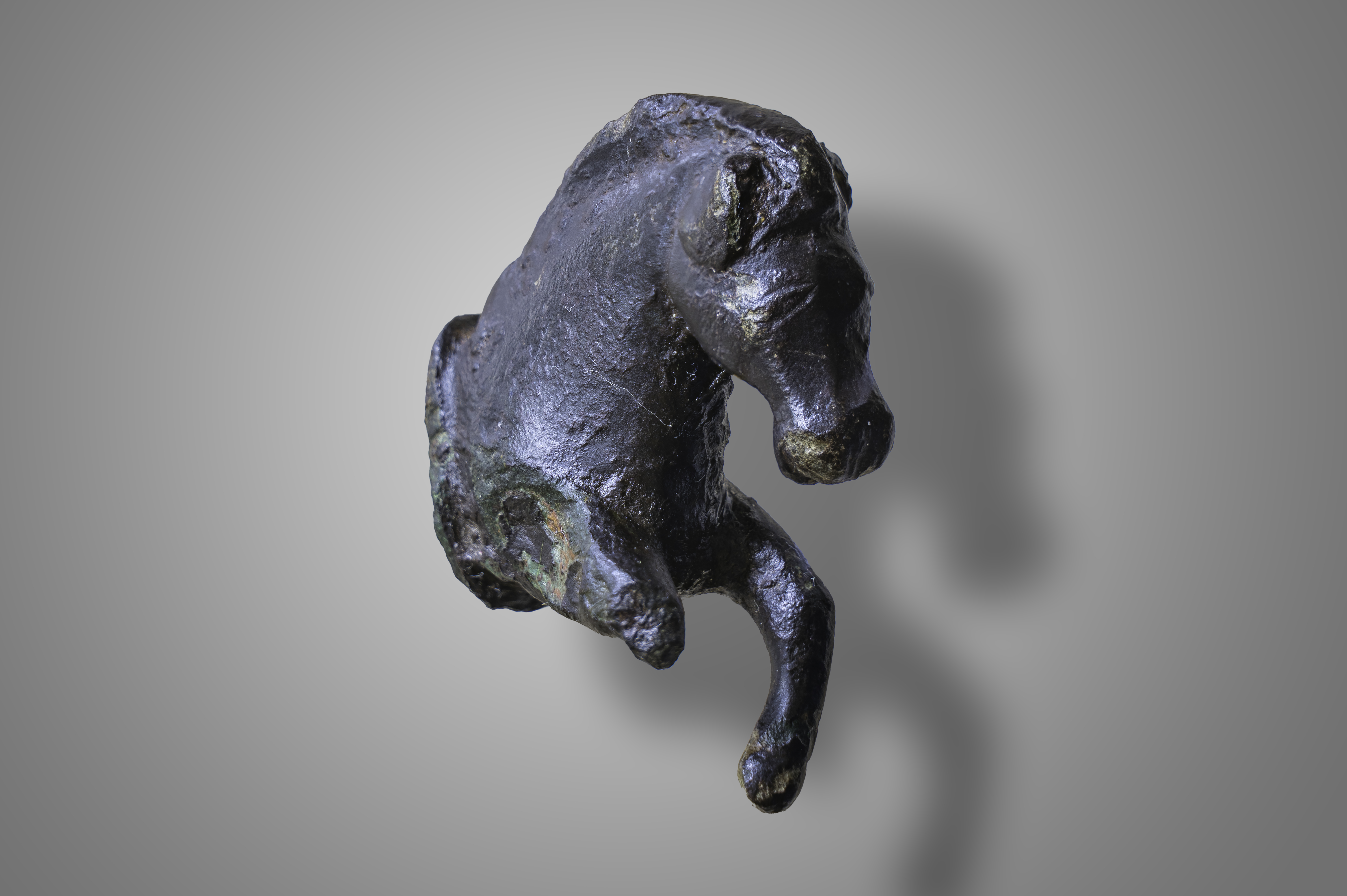 Als eerste hopen we antwoord te vinden op waarom we maar de helft van een steigerend paard hebben en waarvoor dit beslagstuk gebruikt werd. Was het van een wapen, een knop van een Centurion stok, van een rijtuig, kunstwerk, speelgoed of onderdeel van een meubelstuk? Zodoende belandden we in collectie van Museum het Valkhof in Nijmegen, waar we eenzelfde soort paardje aantroffen (gevonden tijdens de opgravingen van de St. Stevenskerkhof in 1883), en overigens het enige andere bekende exemplaar in Nederland. Aan de hand van het gestileerde karakter van het paardje uit het museum, worden beide objecten gedateerd in de vroege 4de eeuw na Chr. Deze werd waarschijnlijk gebruikt als versierstuk van een gebruiksvoorwerp, zoals een ketel, tafel, kast, kandelaar, weegschaal, enzovoorts.