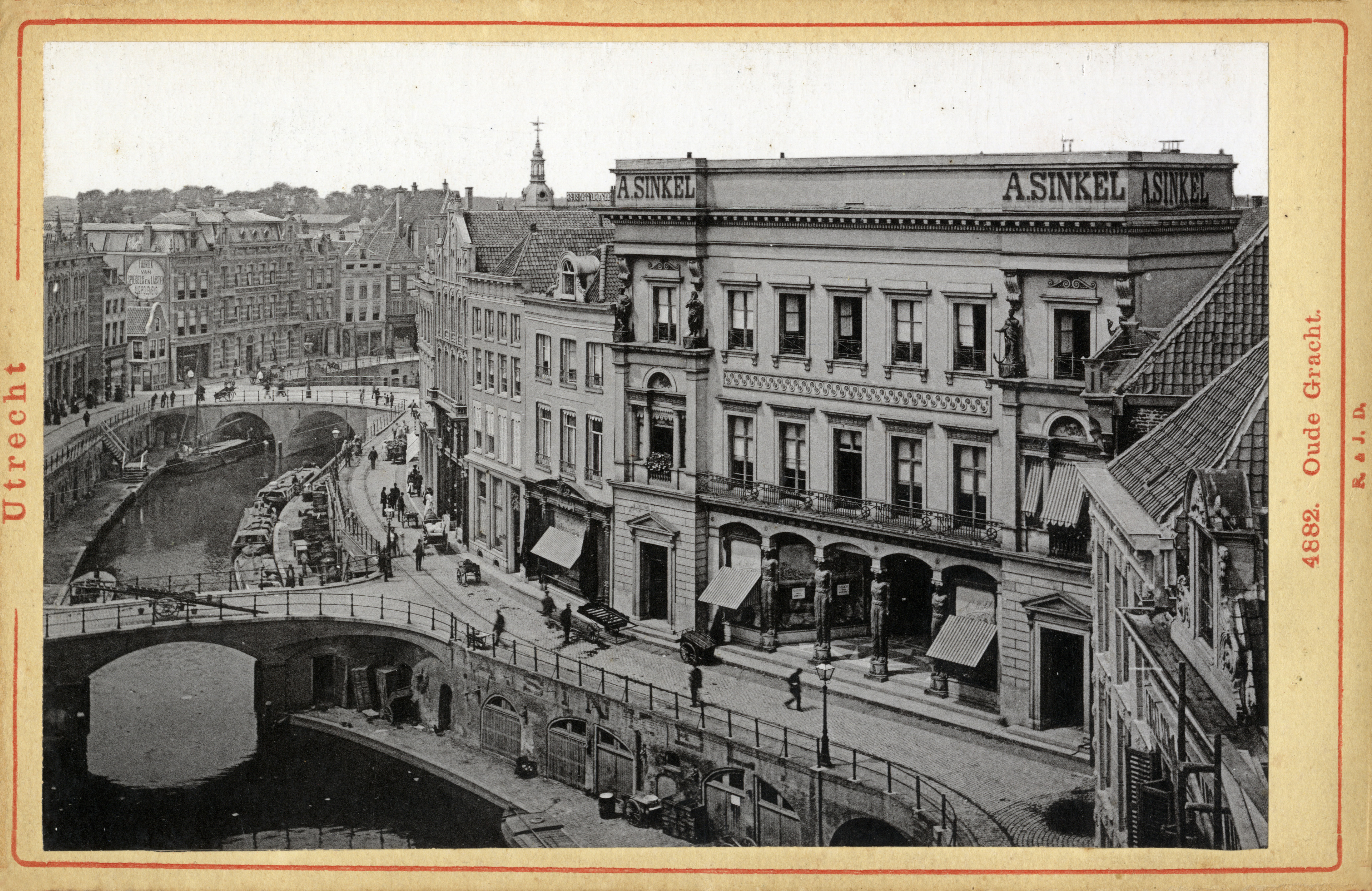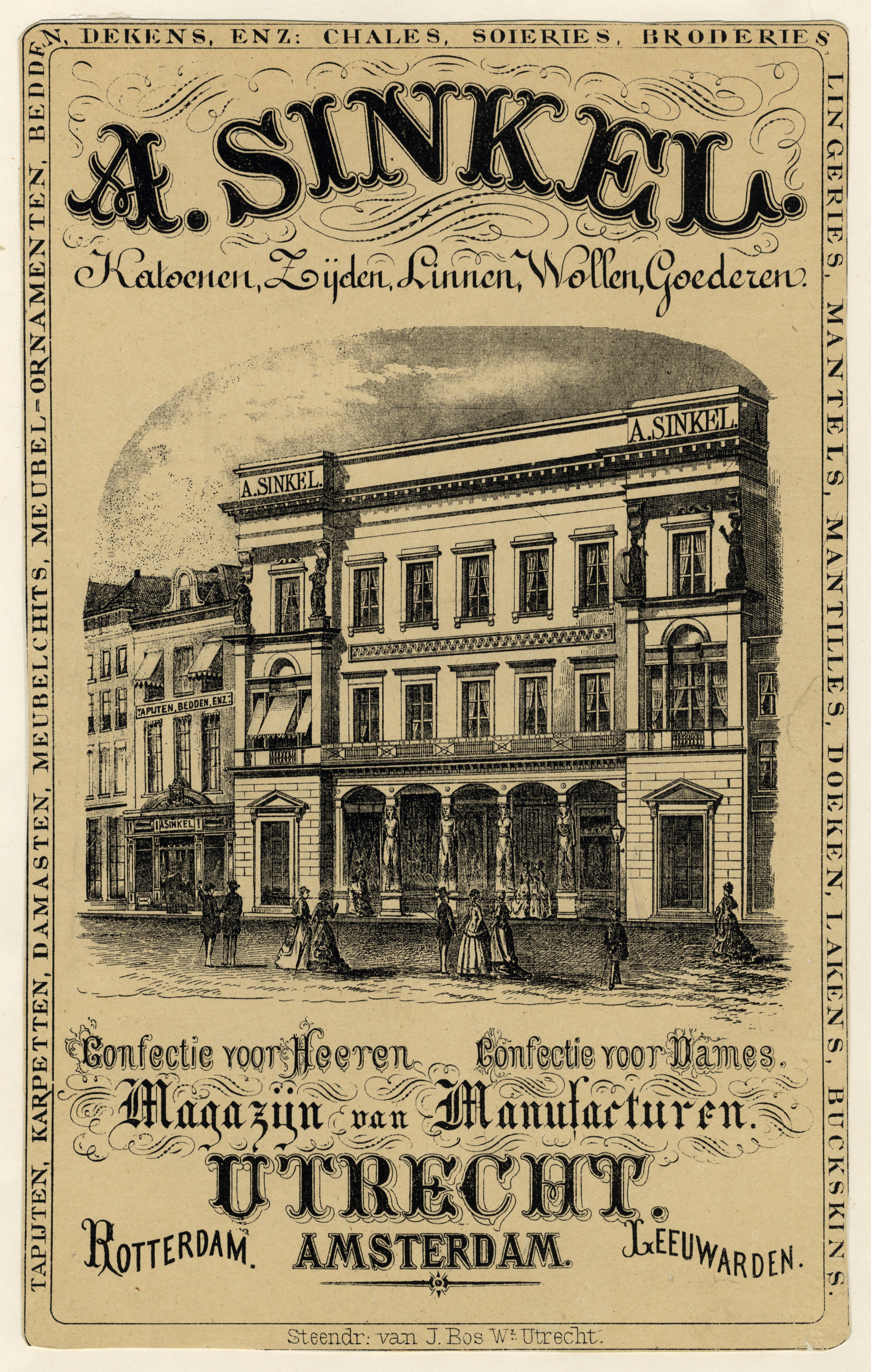 ‘Daar kan men krijgen: Mandjes met vijgen, doosjes pommade, flesjes orgeade (siroop), hoeden en petten, en dames corsetten. Drop om te snoepen, en pillen om te poepen’. Dit reclamerijmpje is van het warenhuis van de Duitse ondernemer Anton Sinkel. Hij opende in 1839 een winkel aan de Utrechtse Oudegracht, in navolging van zijn succesvolle warenhuizen in Amsterdam en andere steden. Anton Sinkels winkel veranderde het aanzien van de Oudegracht.