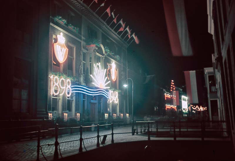 Redactiekantoor Utrechtsch Nieuwsblad Drift 23, in augustus 1948 feestelijk verlicht vanwege het 50-jarig regeringsjubileum van koningin Wilhelmina. Fotograaf C. Stevens / Het Utrechts Archief / collectie beeldmateriaal - 1948 CC BY 4.0