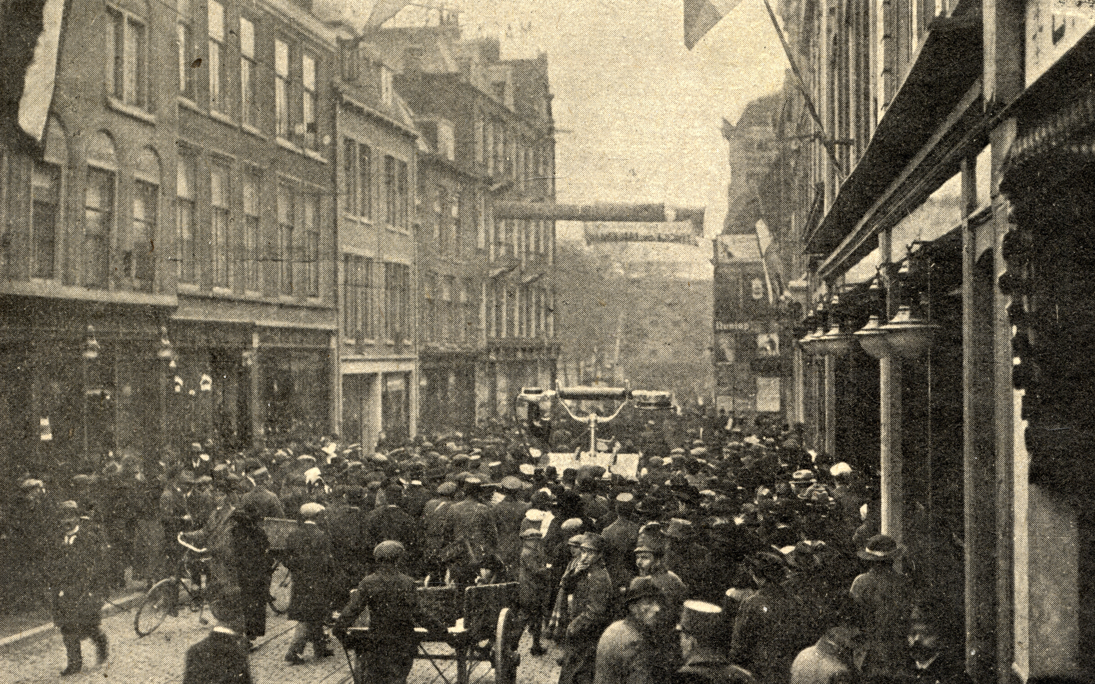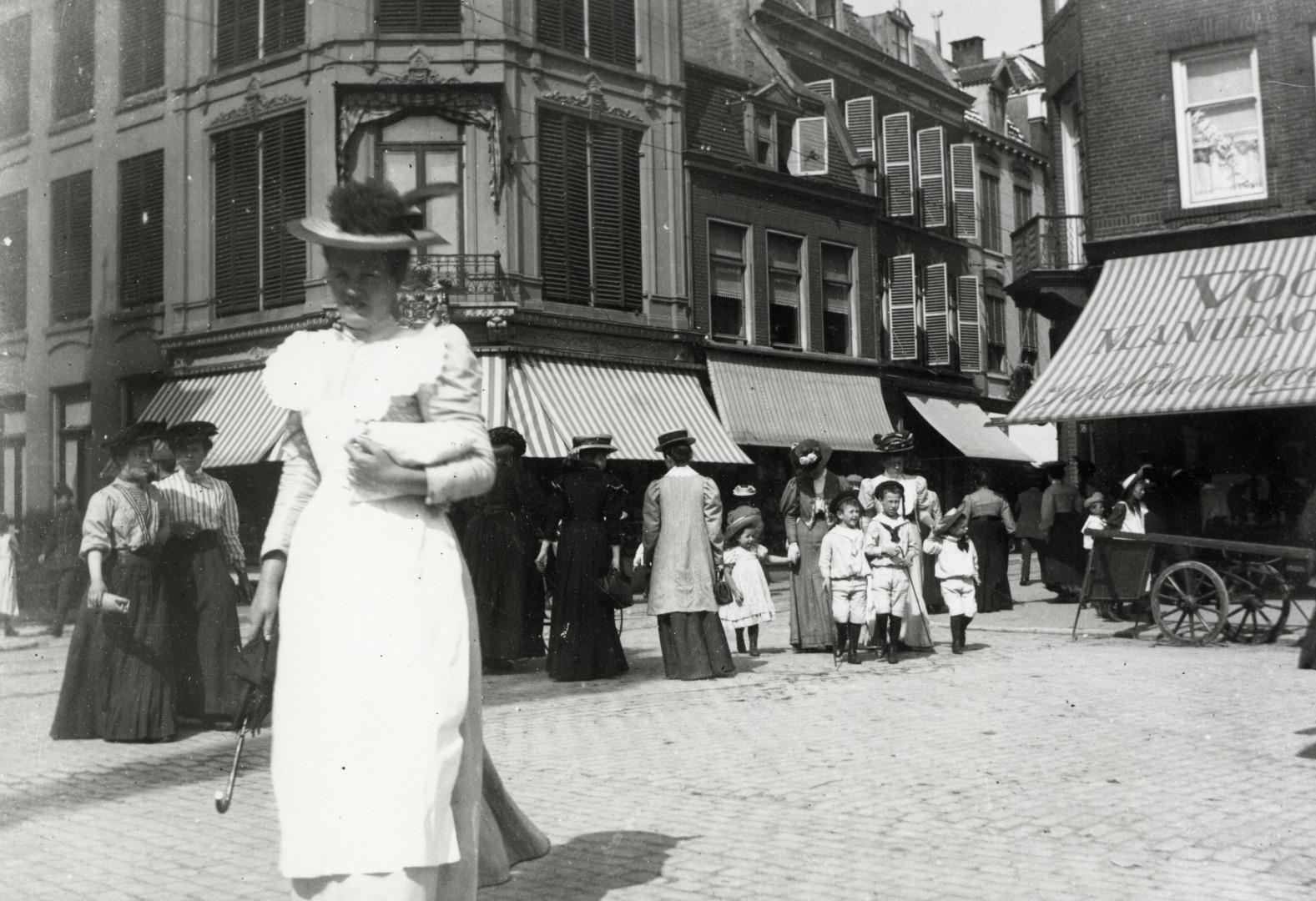Gezicht in de Lange Viestraat te Utrecht met een gedeelte van de voorgevels van enkele huizen; rechts de ingang van het Vredenburg en links de ingang van de Korte Viestraat. Moesman, Joh. A. / 61958 - 1900 Publiek Domein 1.0